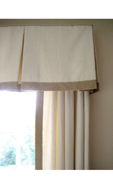 FLAT FRONT AND PINCH-PLEATED VALANCES: Whether you’re measuring for flat front valances or pinch-pleated valances with pre-sewn/ fixed pleats, the math is pretty simple.  Just remember one easy-peasy formula – the width of your windows/ drapery pole plus a few centimetres extra for coverage.