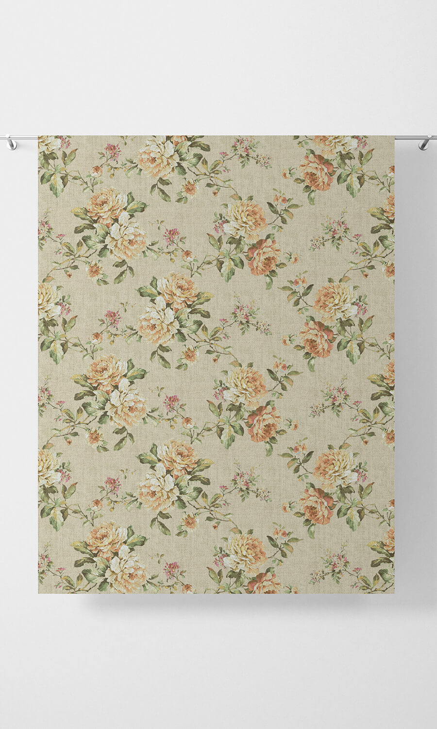 - The gentle orange blooms set against a beige base, bringing a mellow, sun-dappled warmth