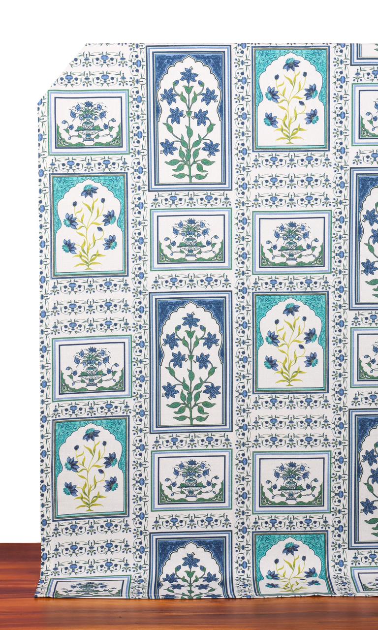 A montage of classical Indian motifs, 'Bugle Light' is a pure cotton fabric where timeless oriental artistry meets modern understated elegance. Inspired by the ornate 'jharokhas' and floral embellishments of the Thar's Mughal palaces, yet grounded in the casual livability of cotton and humble coastal hues, this fabric is a unique blend of regal grandeur and laid-back aesthetic. It is perfect for eclectic interiors, casual living spaces and bohemian retreats that celebrate both heritage and comfort.