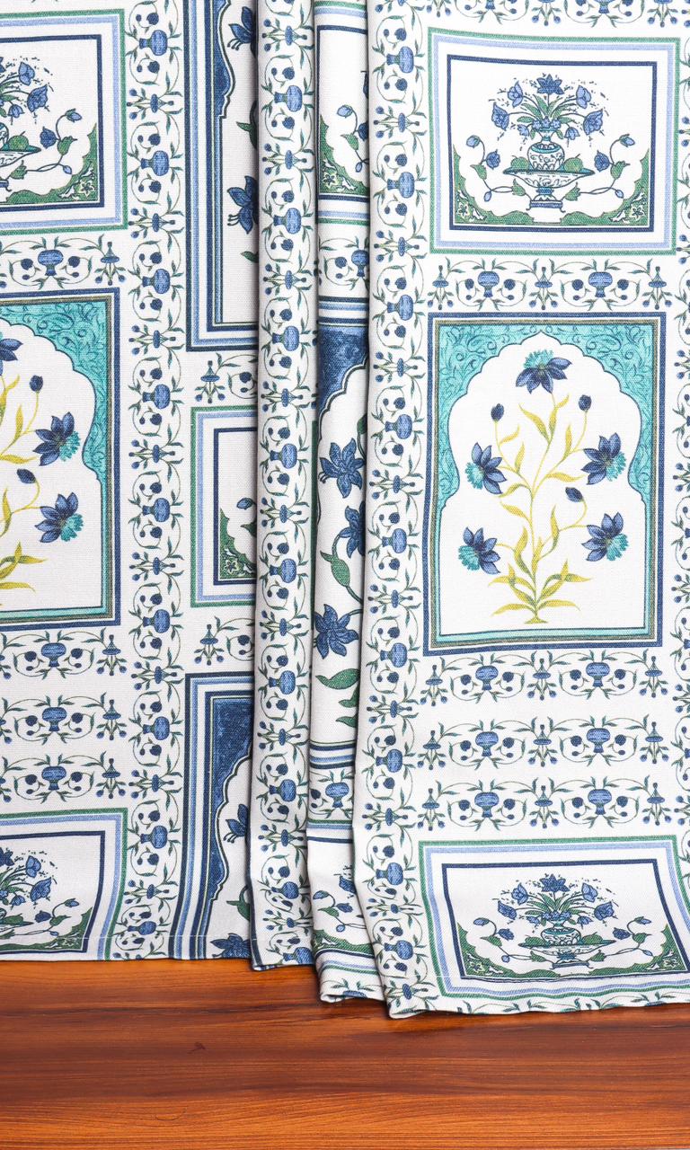 A montage of classical Indian motifs, 'Bugle Light' is a pure cotton fabric where timeless oriental artistry meets modern understated elegance. Inspired by the ornate 'jharokhas' and floral embellishments of the Thar's Mughal palaces, yet grounded in the casual livability of cotton and humble coastal hues, this fabric is a unique blend of regal grandeur and laid-back aesthetic. It is perfect for eclectic interiors, casual living spaces and bohemian retreats that celebrate both heritage and comfort.