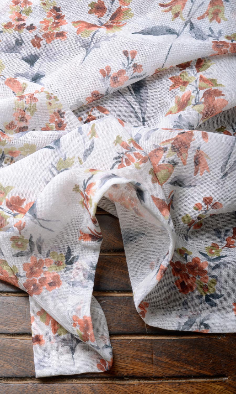 - The rustic beauty of its all-over print of dainty orange flowers on a white backdrop