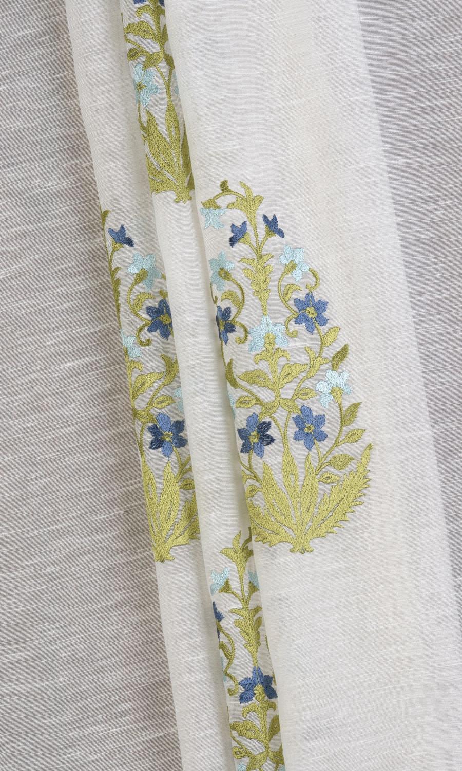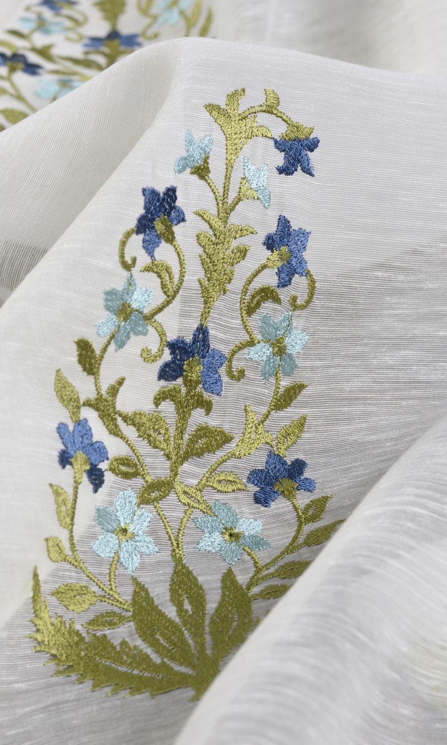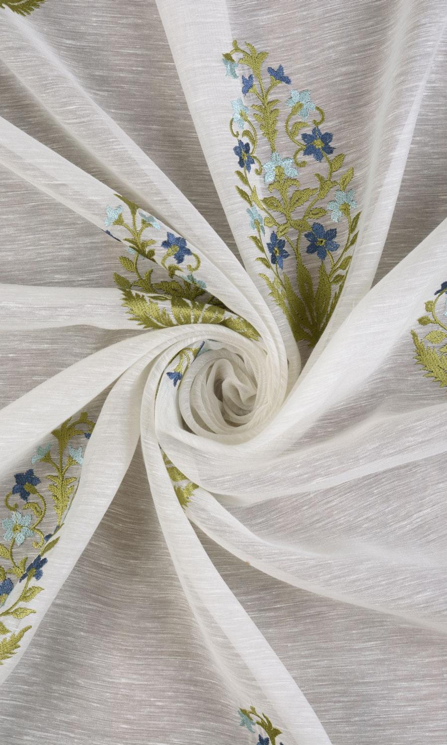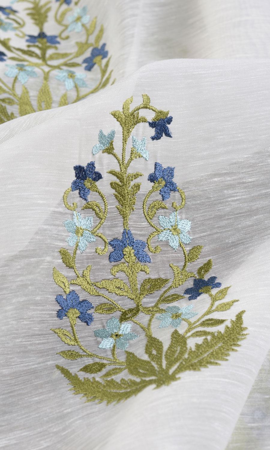 Marrying the timeless charm of heritage motifs with the homely warmth of needlepoint florals, 'Citrus Spice' beckons a beauty that is unforgettable. The hush of white sets the stage for blue blossoms cradled in olive green fronds to bring a breezy garden-fresh feel to the room. While the ornate paisleys make a winsome ambience, its white sheer base brings in light, air and a whimsical joy - all without trading off your privacy.