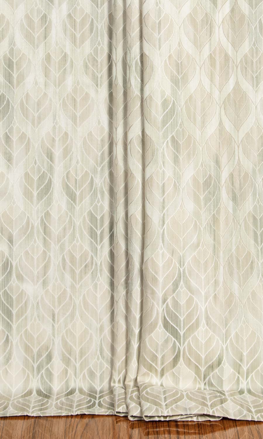 'Cosmic Green' evokes the whimsical beauty of dew-bathed foliage in its soft green ogee-style leaf print, made more lively with its raised contours. Each leaf shimmers ever so gently, adding a serene rhythm to a sunlit living room and a quiet glamour to a neutral-toned bedroom. It brings a fresh organic note to the decor with a soft gleam, making it ideal for formal and semi-formal spaces across various decor styles.