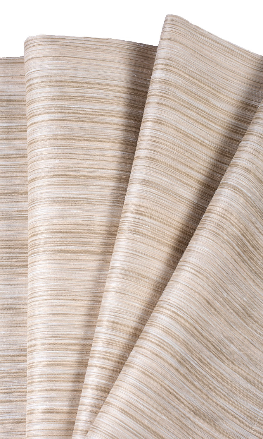 Timelessly elegant and effortlessly glamorous, 'Cowhide' is a beige faux silk that echoes the mellow richness of sunlit sand and aged parchment. Its gentle, sandy tone, deepened and softened in a rhythmic flow by fine striations, offers an interplay of lustre and texture. Its graceful drape and soft glow are the perfect layer for serene interiors that embrace light, air and quiet luxury.