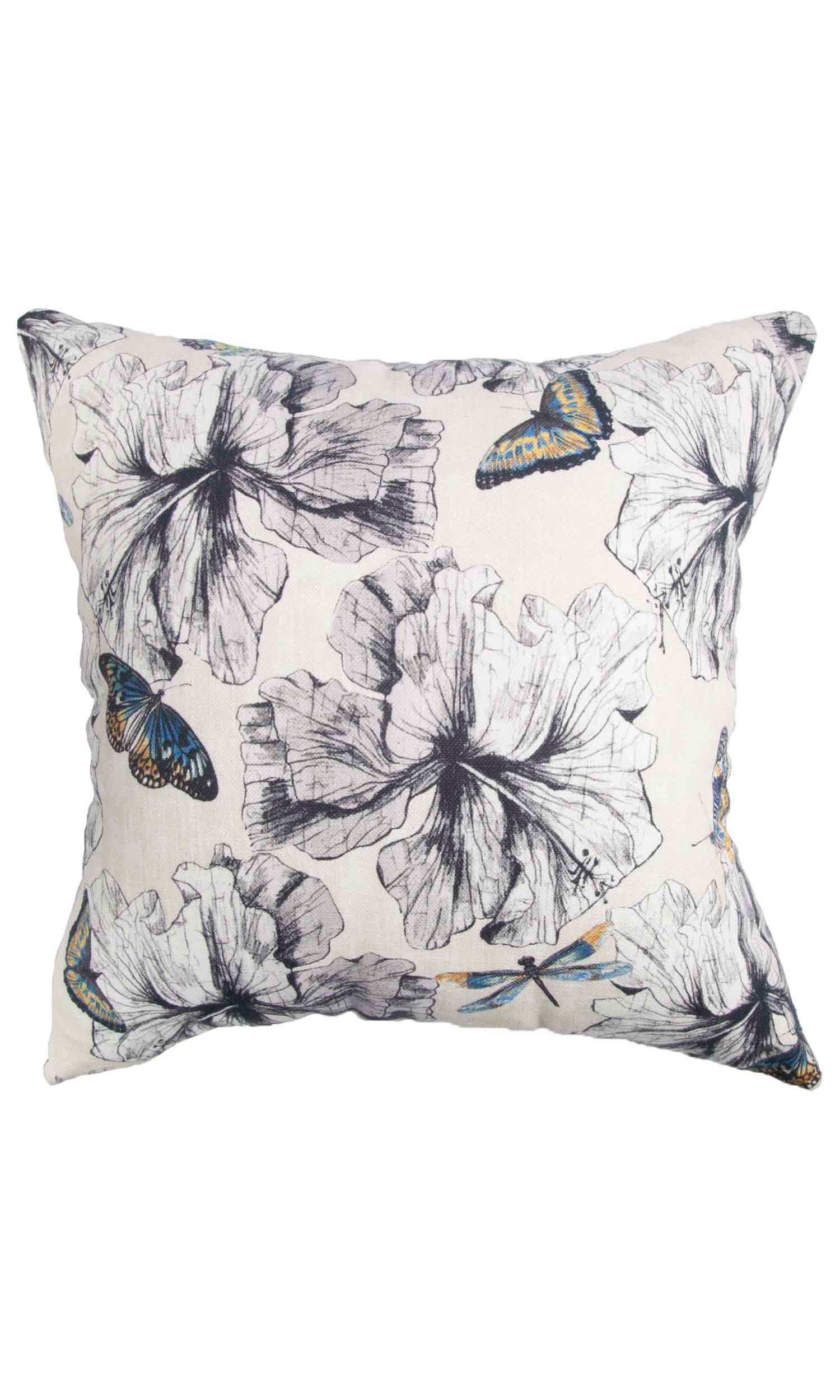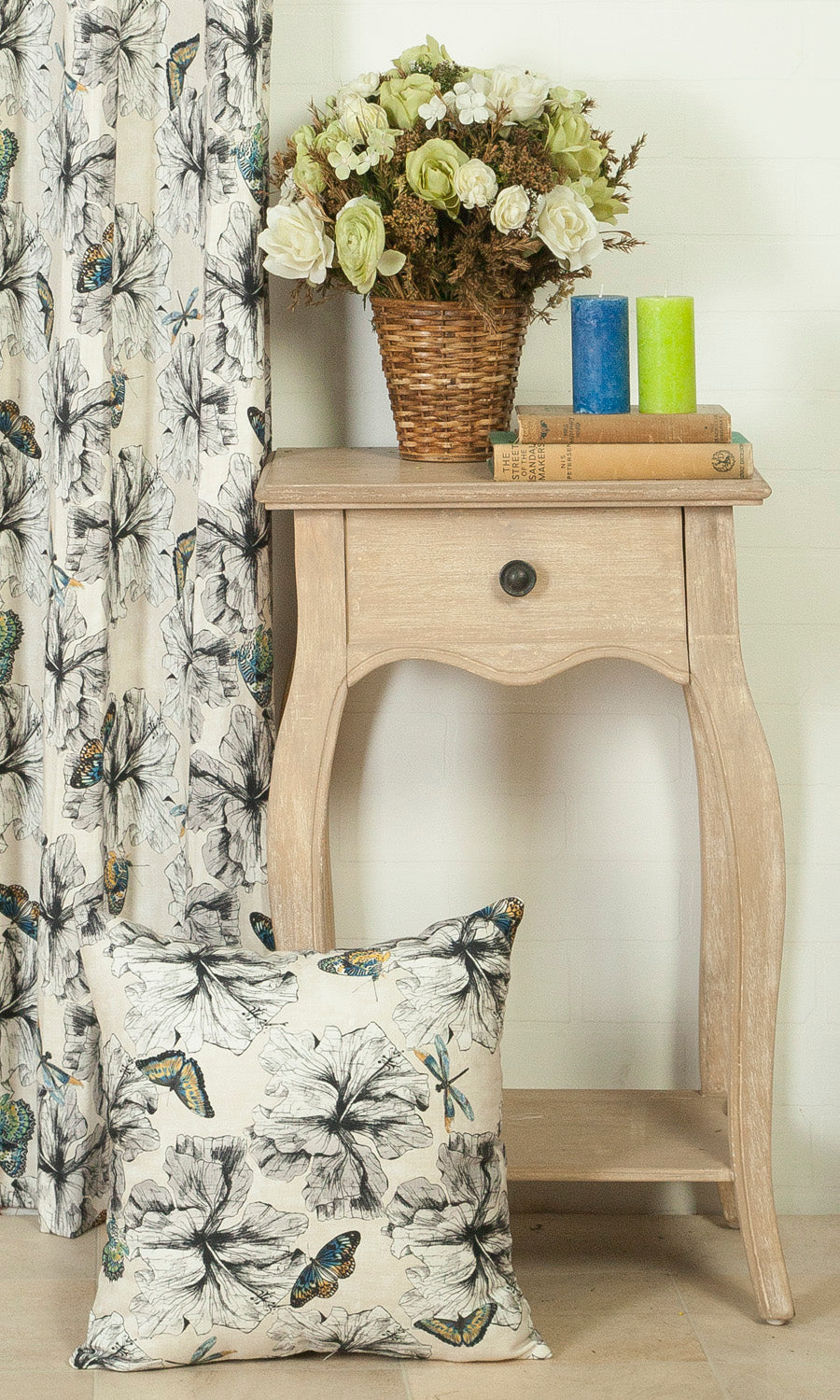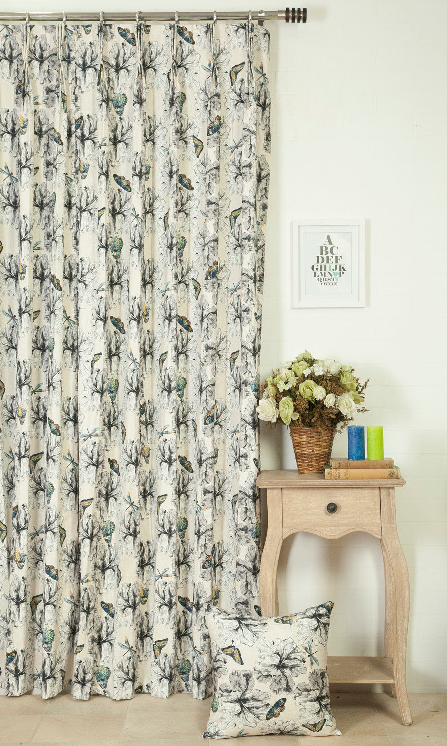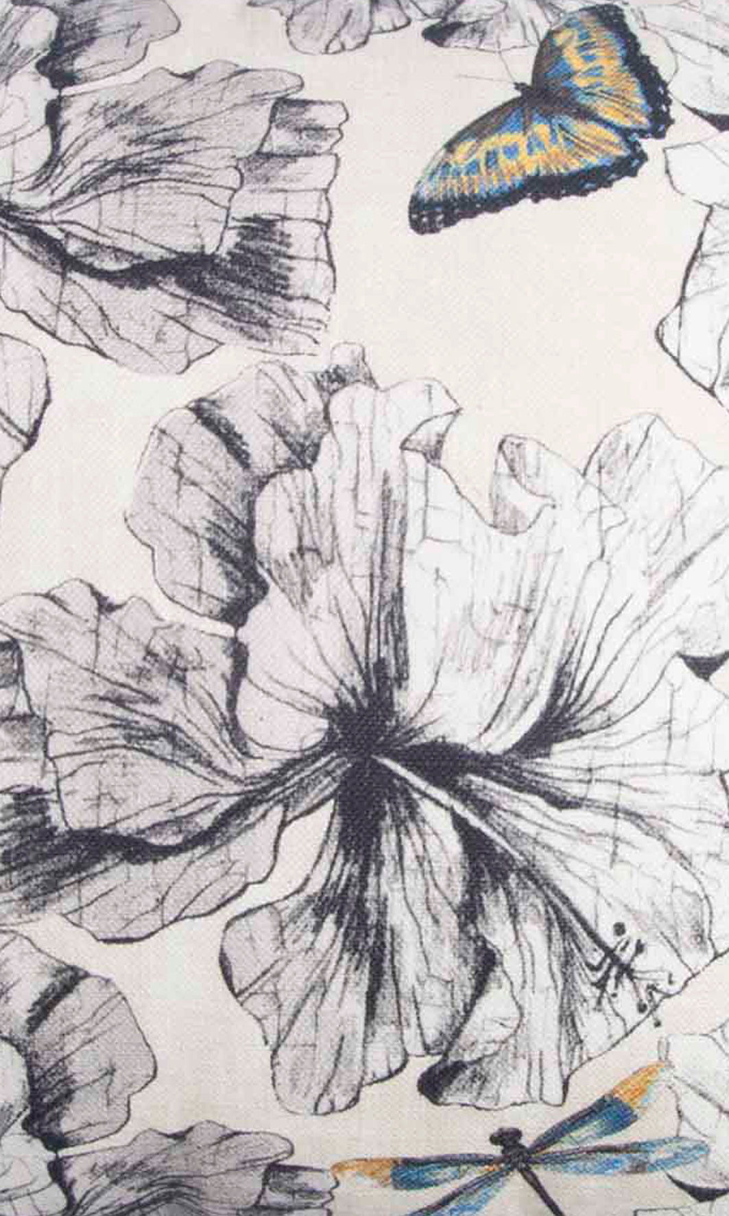 Depicting an idyllic theme of shoeflowers flanked by butterflies and dragonflies on a pure cotton base, 'Creamy Amber' makes a perfect finishing touch for a home with an outdoorsy theme, kids' rooms and pattern-friendly decor styles.