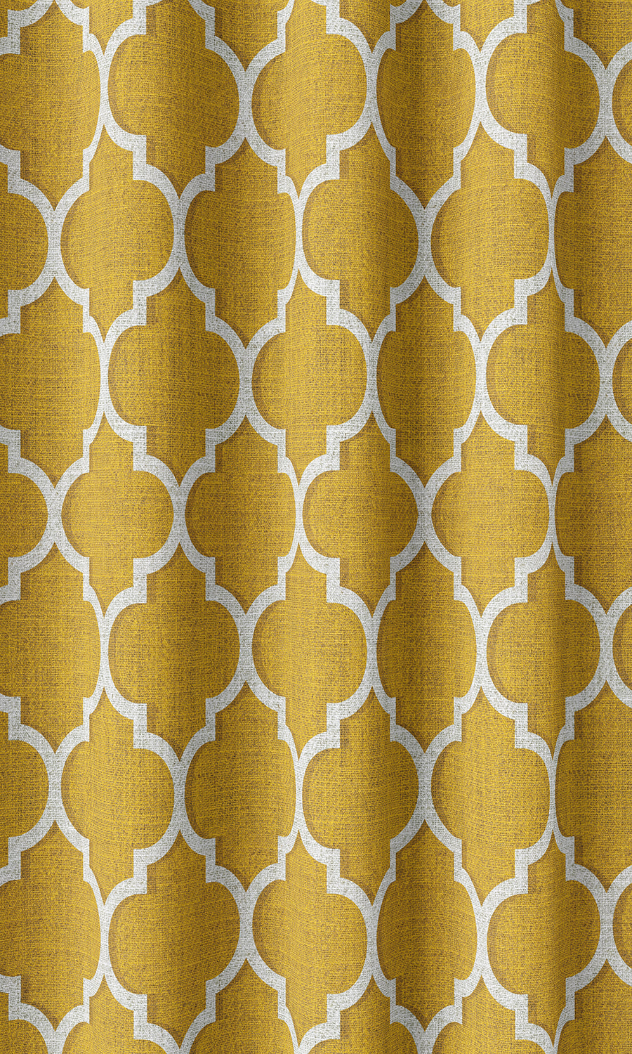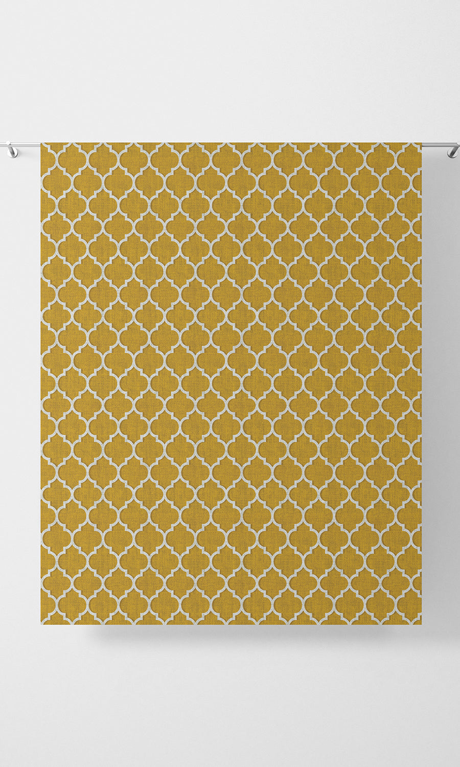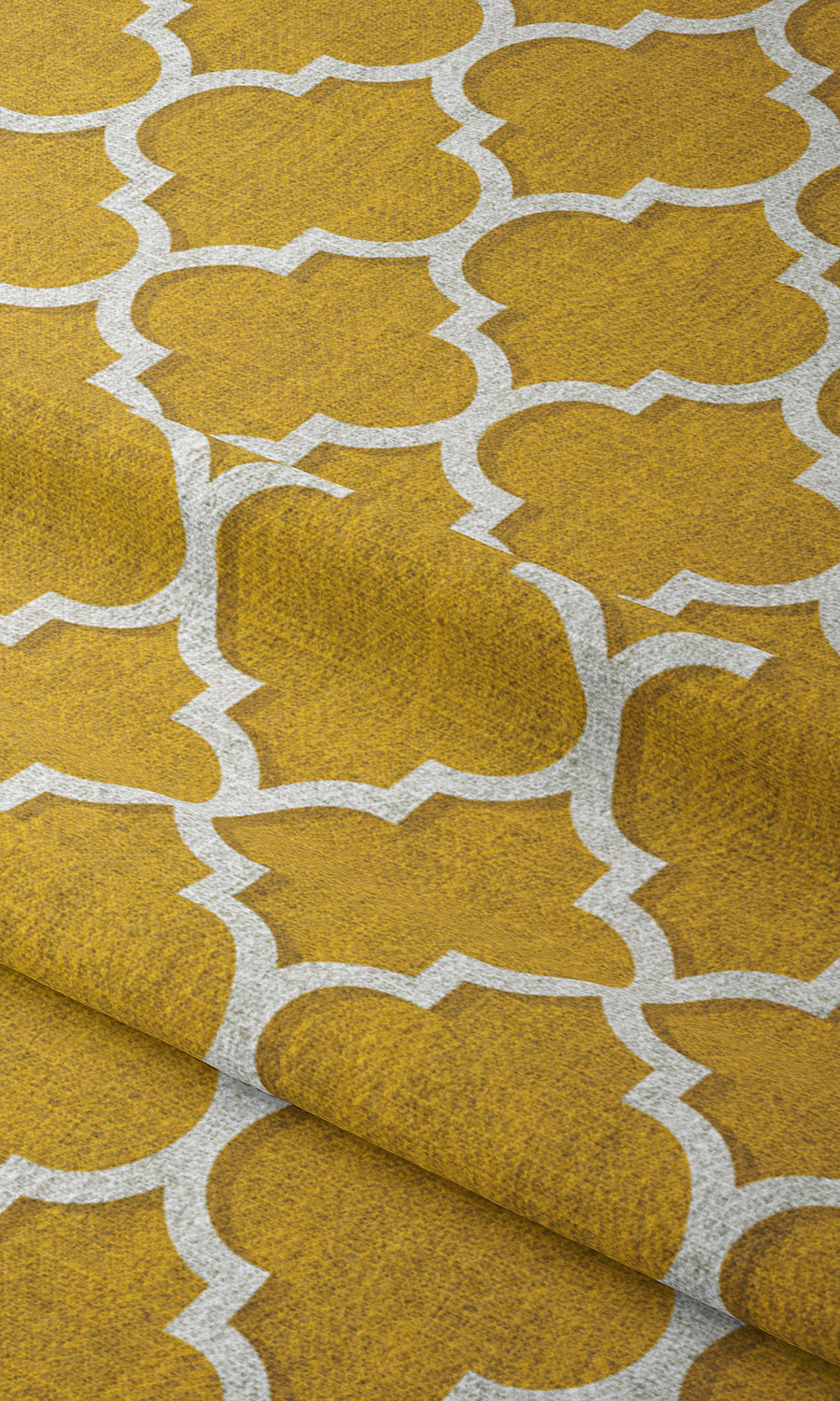 'Curio' draws inspiration from the ornate geometry of Moroccan tilework, where pointed star motifs and curving lines create a striking balance of precision and artistry. The bright pumpkin yellow infuses the design with warmth and vibrancy, making it a bold yet elegant choice for interiors that embrace pattern and character. Whether lending a sense of grandeur to contemporary spaces or adding a touch of old-world charm to eclectic settings, this fabric is a statement of heritage reimagined with modern energy.