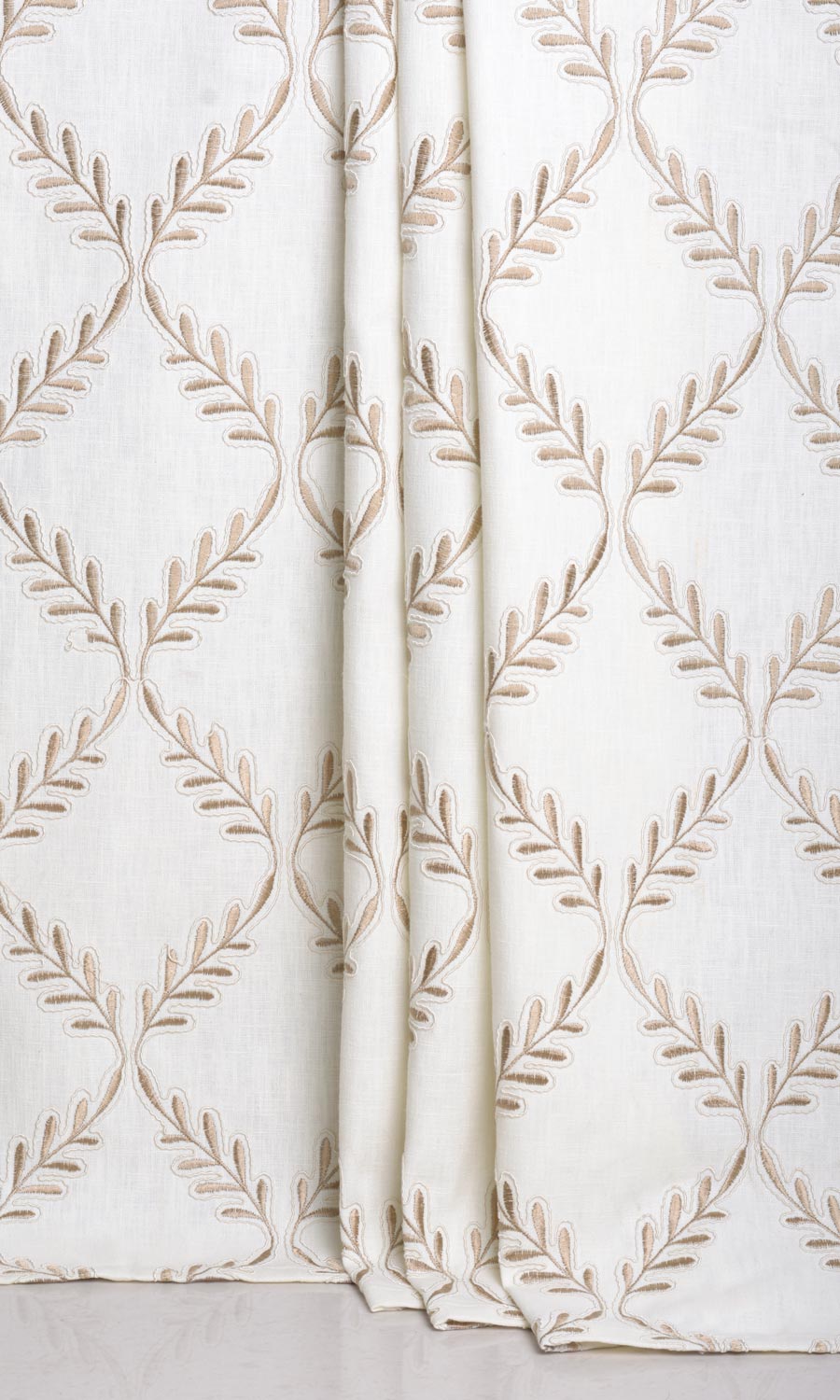 Botanical and geometric motifs merge in 'Dawn Pie' to render a nature-inspired aesthetic with a modern flair. Its delicate leaf vines surging upward in a lattice pattern carry curvy details, embroidered texture and subtle colour contrast for visual allure. Enriched by both the airy elegance of pure linen and the structural quality of polyester, this fabric promises to drape smoothly, fall elegantly and fold neatly.