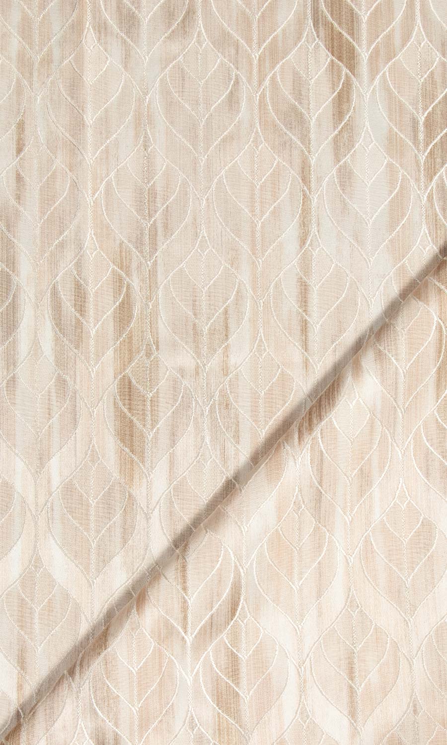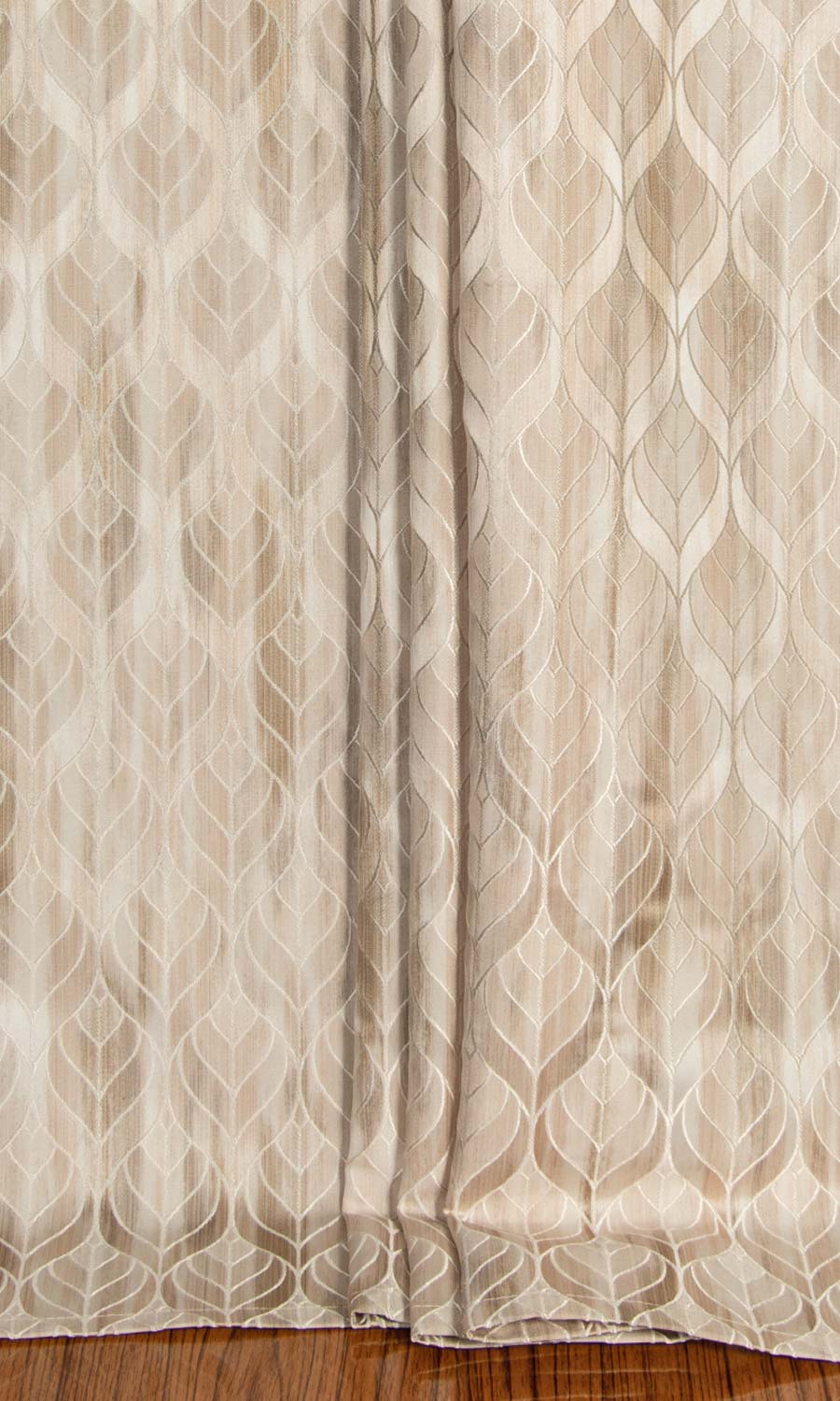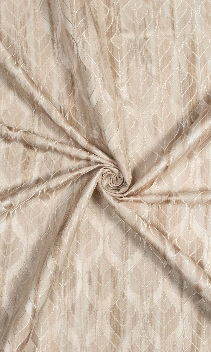 'Faith' channels understated elegance through its pale beige ogee-style leaf print, subtly elevated by delicately raised contours. Each leaf shimmers ever so gently, adding a serene rhythm to a sunlit living room and a quiet glamour to a neutral-toned bedroom. It brings a fresh note to the decor with a soft gleam, making it ideal for formal and semi-formal spaces across various decor styles.