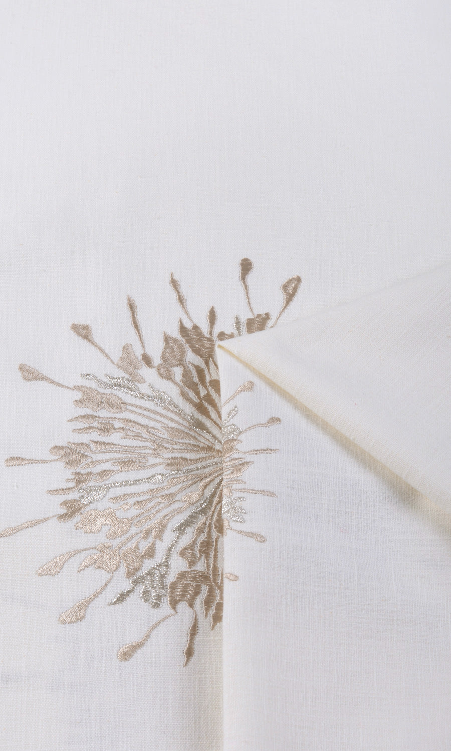 A home that loves to incorporate a touch of nature but shies away from vibrance can look to 'Genoa's delicate sunburst design enriched with beautiful satin embroidery and lustrous accents. Its soft white punctuated with soft beige recedes into the backdrop rather than stand out, offering a quiet presence that is ready to mingle with any palette and decor style. Its polycotton composition ensures that you can enjoy the understated beauty of natural fibres along with the practical convenience and wrinkle-free appearance of polyester.