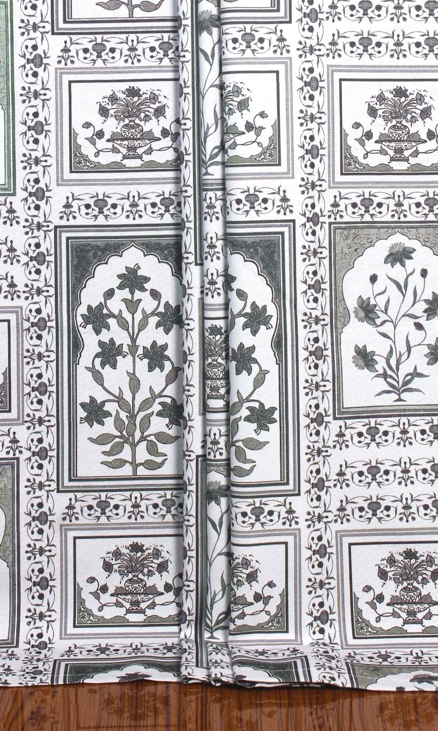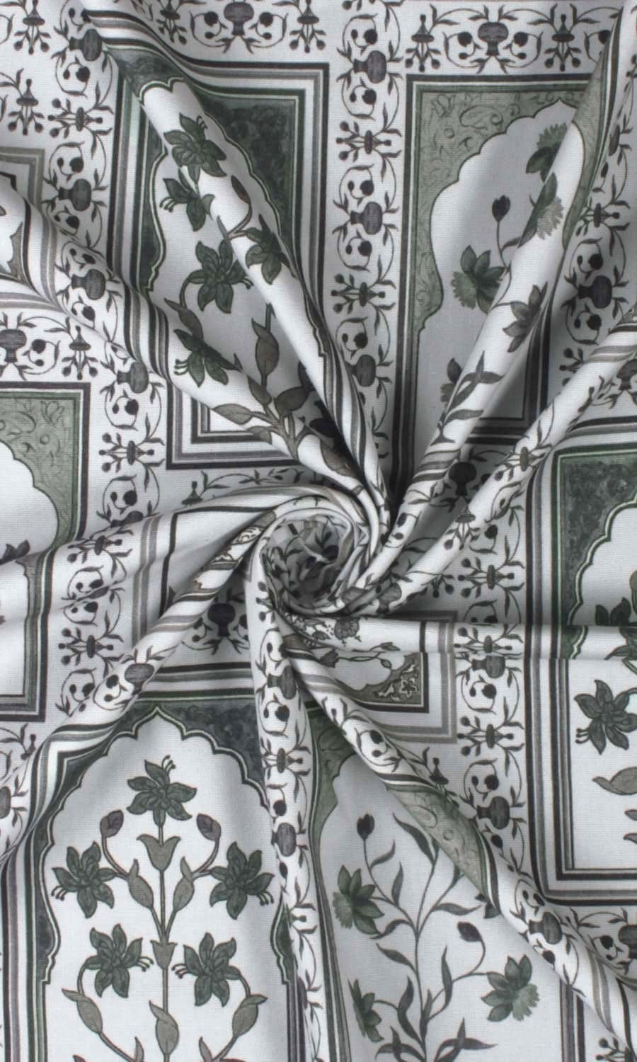 A quiet ode to oriental beauty, 'Glazed Stucco' feels like a time-travelling reverie - where Mughal florals unfurl around ornate 'jharokhas' - regal in presence and rich with nostalgia. Printed on an understated greyscale pure cotton base, this fabric beautifully blends classical extravagance with modern simplicity. Whether styled in an eclectic living room, a layered bohemian haven or a maximalist's collected space, this fabric brings an old-world rhythm where heritage and comfort go hand in hand.