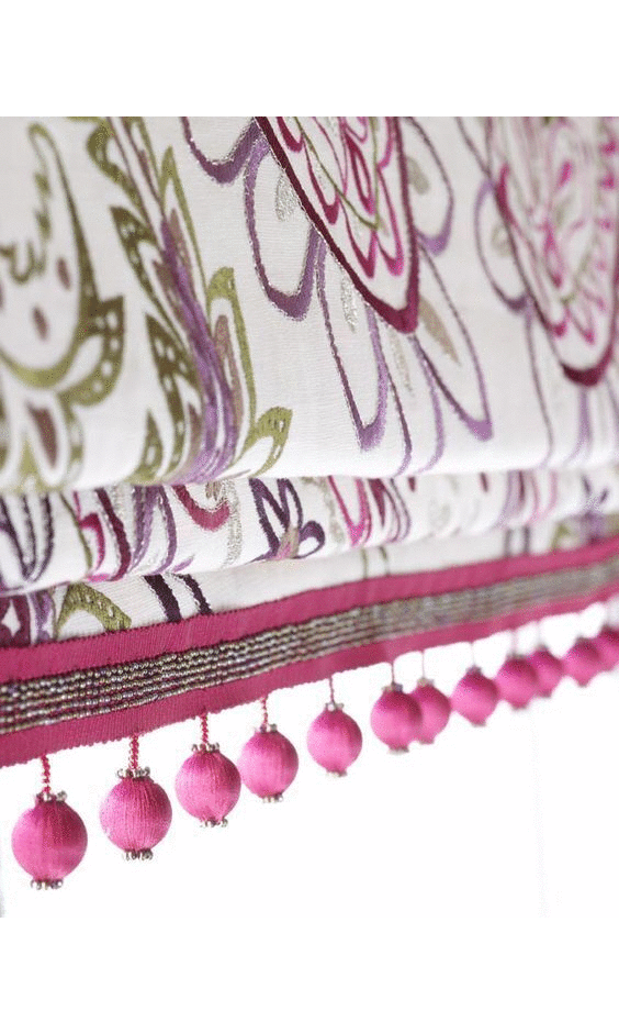 Tassel trims are handstitched on the bottom hem of roman shades for a sumptuous effect.