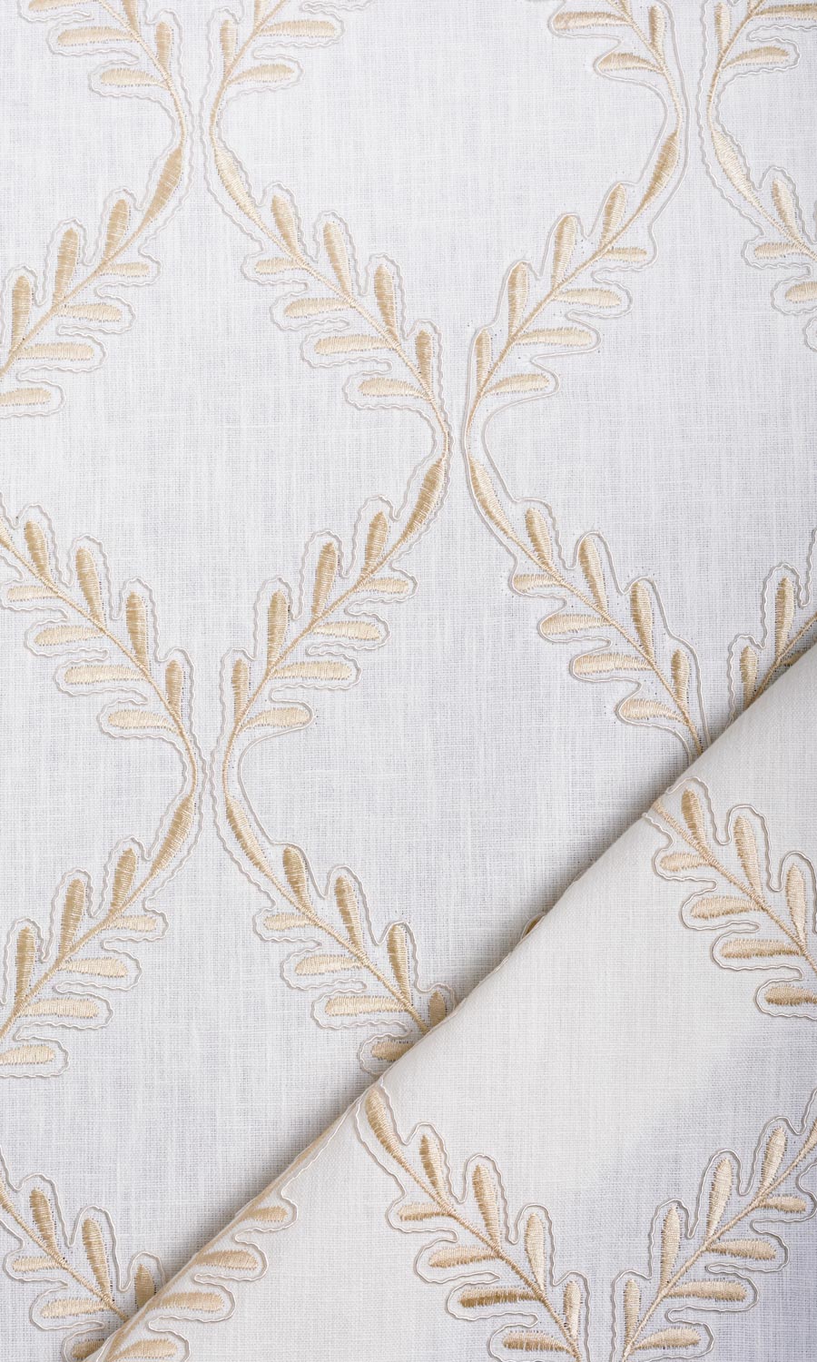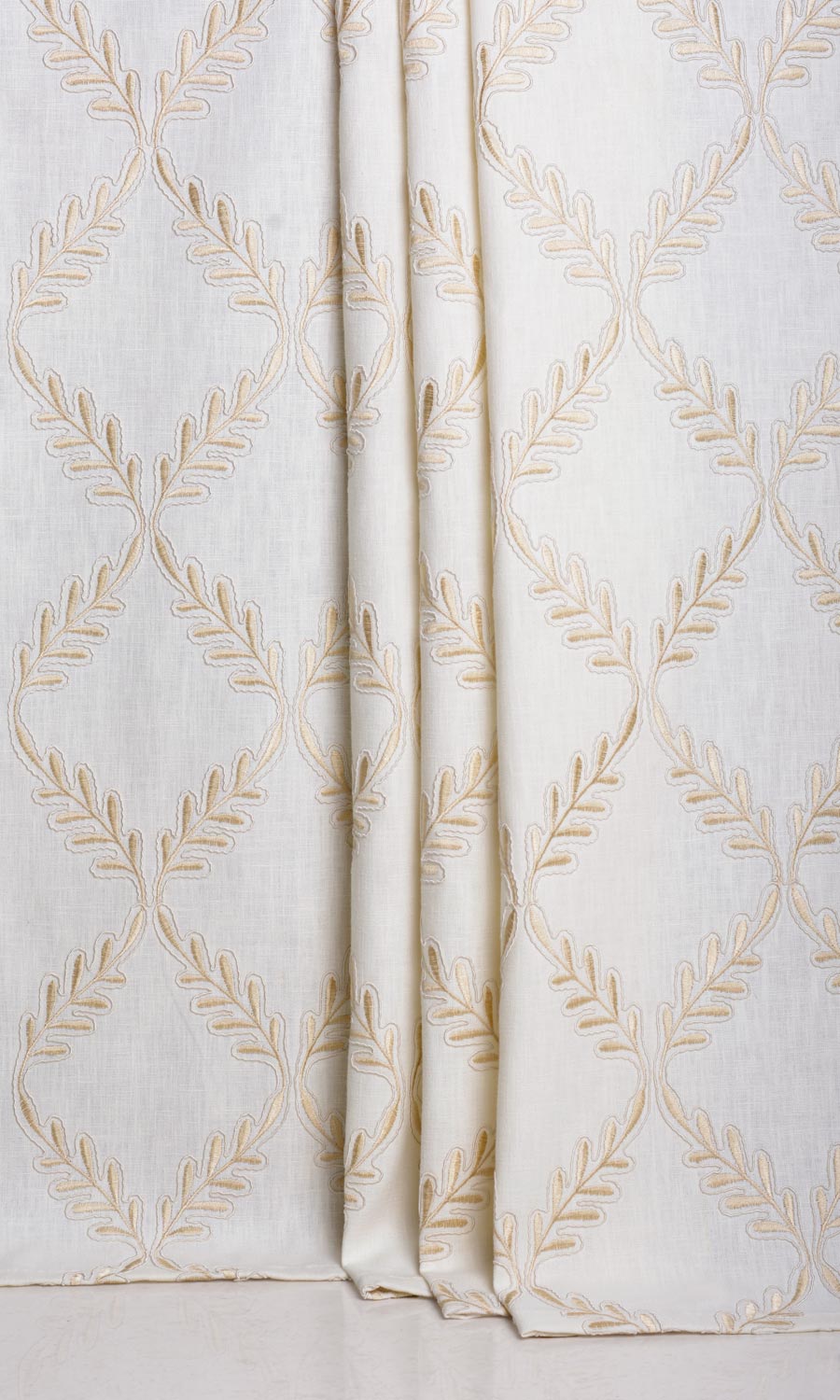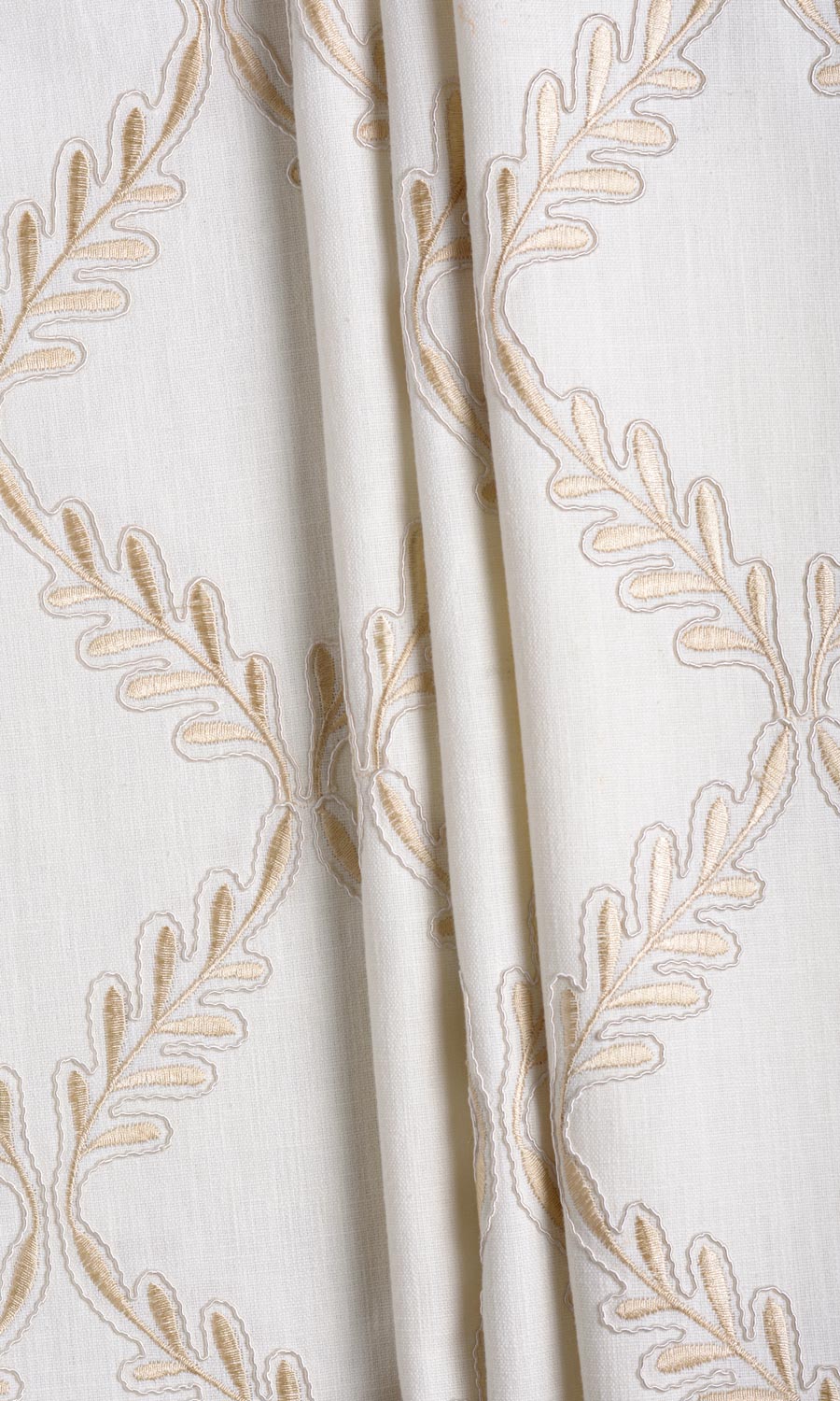 Botanical and geometric motifs merge in 'High Sonnet' to render a nature-inspired aesthetic with a modern flair. Its delicate leaf vines surging upward in a lattice pattern carry curvy details, embroidered texture and subtle colour contrast for visual allure. Enriched by both the airy elegance of pure linen and the structural quality of polyester, this fabric promises to drape smoothly, fall elegantly and fold neatly.