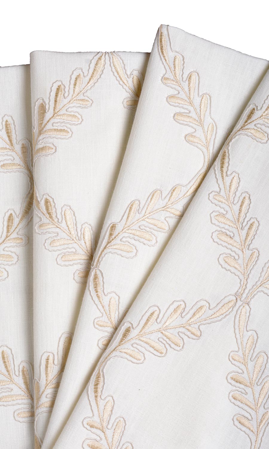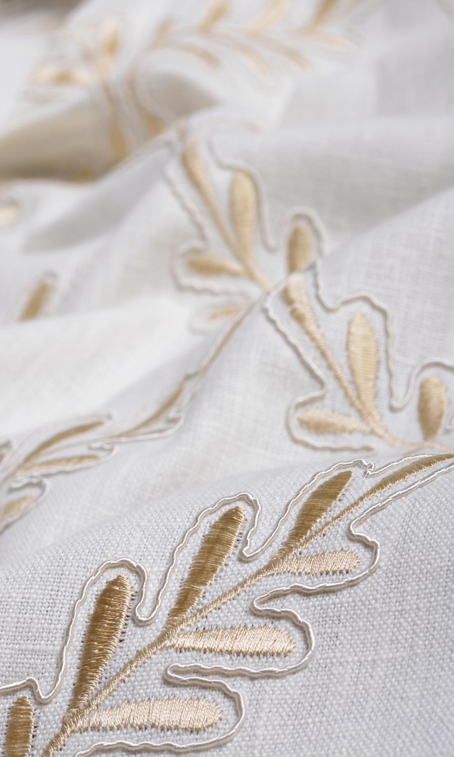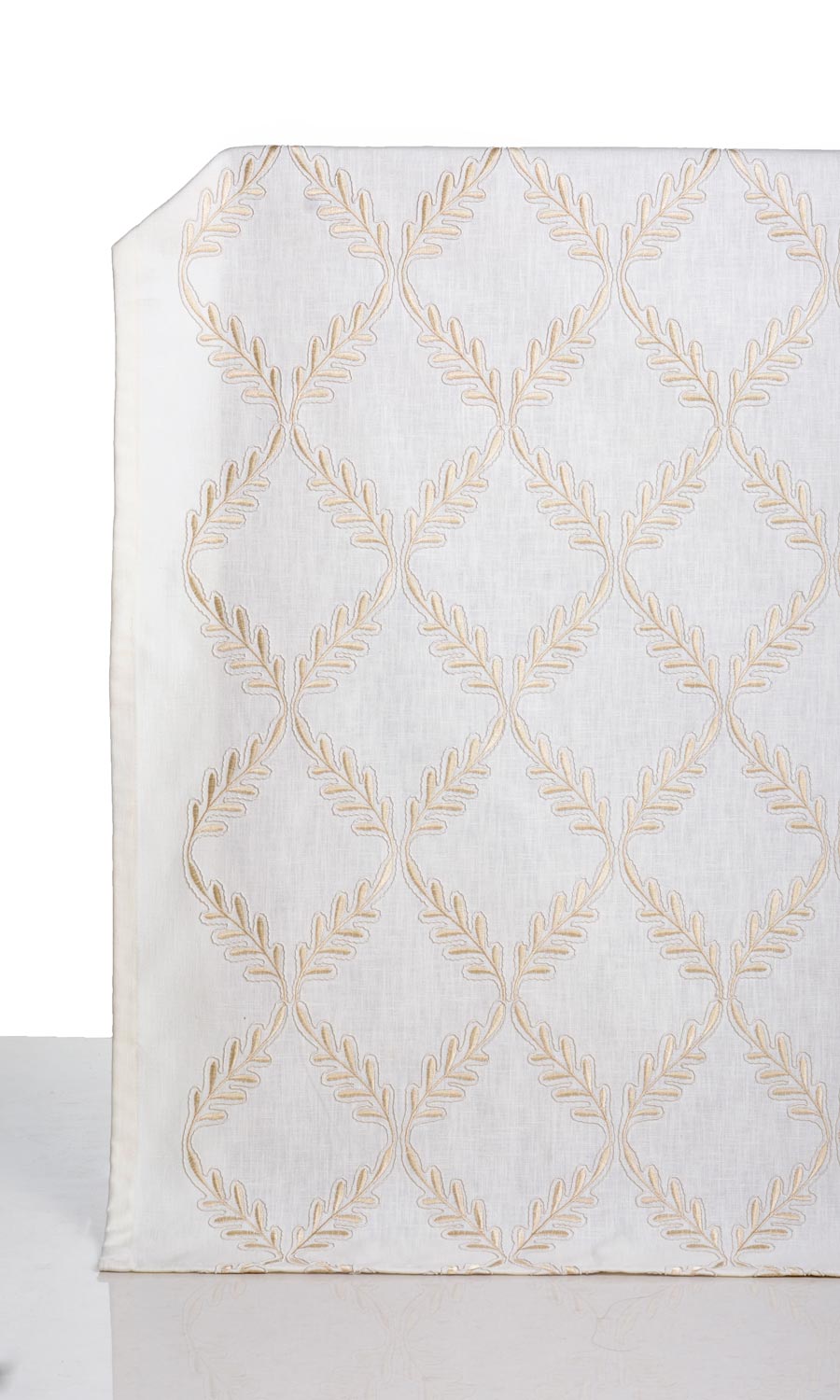 Botanical and geometric motifs merge in 'High Sonnet' to render a nature-inspired aesthetic with a modern flair. Its delicate leaf vines surging upward in a lattice pattern carry curvy details, embroidered texture and subtle colour contrast for visual allure. Enriched by both the airy elegance of pure linen and the structural quality of polyester, this fabric promises to drape smoothly, fall elegantly and fold neatly.
