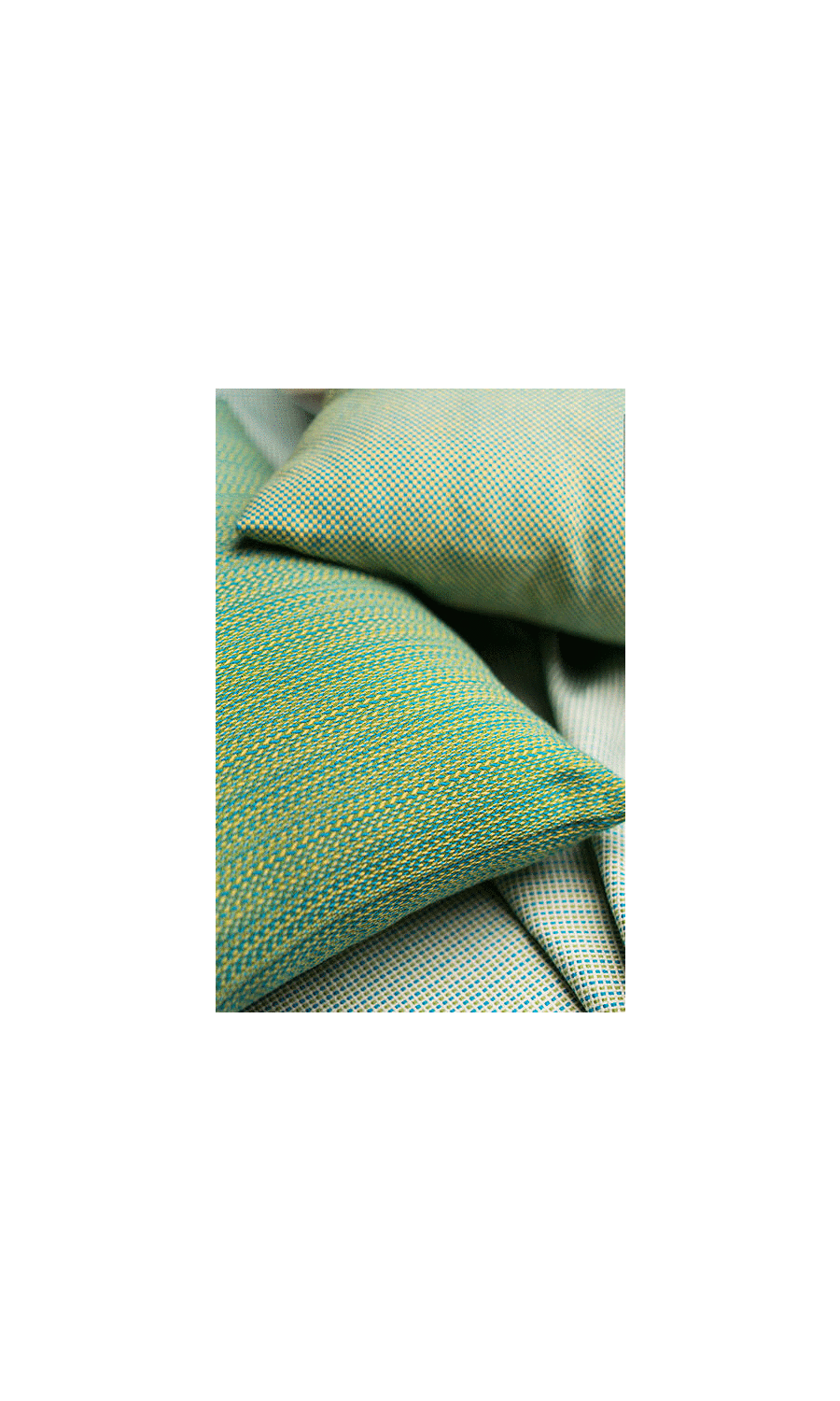 'Infant Smile' is a blue cotton fabric with rustic overtones - an easy finishing touch for a country home sprinkled generously with sisal rugs, burlap runners and slubby linens. Green accent tones and a thick woven texture add depth and intrigue to its blue while the cotton composition lends a matte finish for a homely touch. Count on the goodness of its natural fibres for its countrified appeal and environmental sustainability.