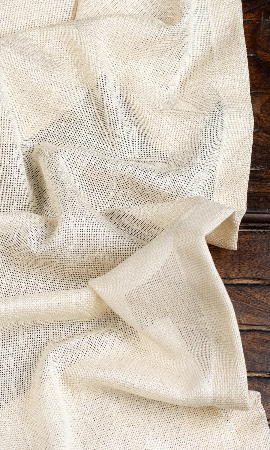 Simplicity and warmth in equal measure - 'Kalista' is a warm ivory open weave fabric that evokes the feel of summer fields and coastal escapes. Light and easy, golden and breezy, this sheer keeps your spaces visually light and fresh. Be it a rustic wood cabin in the forest, a dreamy escape in the desert or a quiet minimalist home in the city, this is the piece that can ground the space in an earthy quality and relaxed mood.