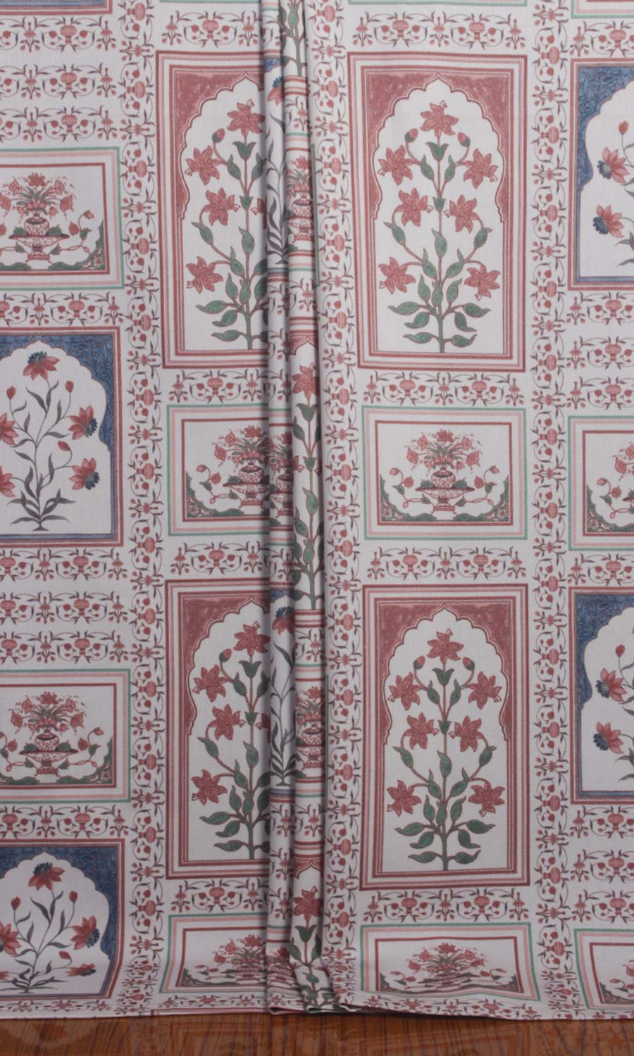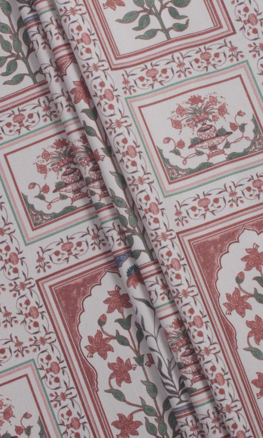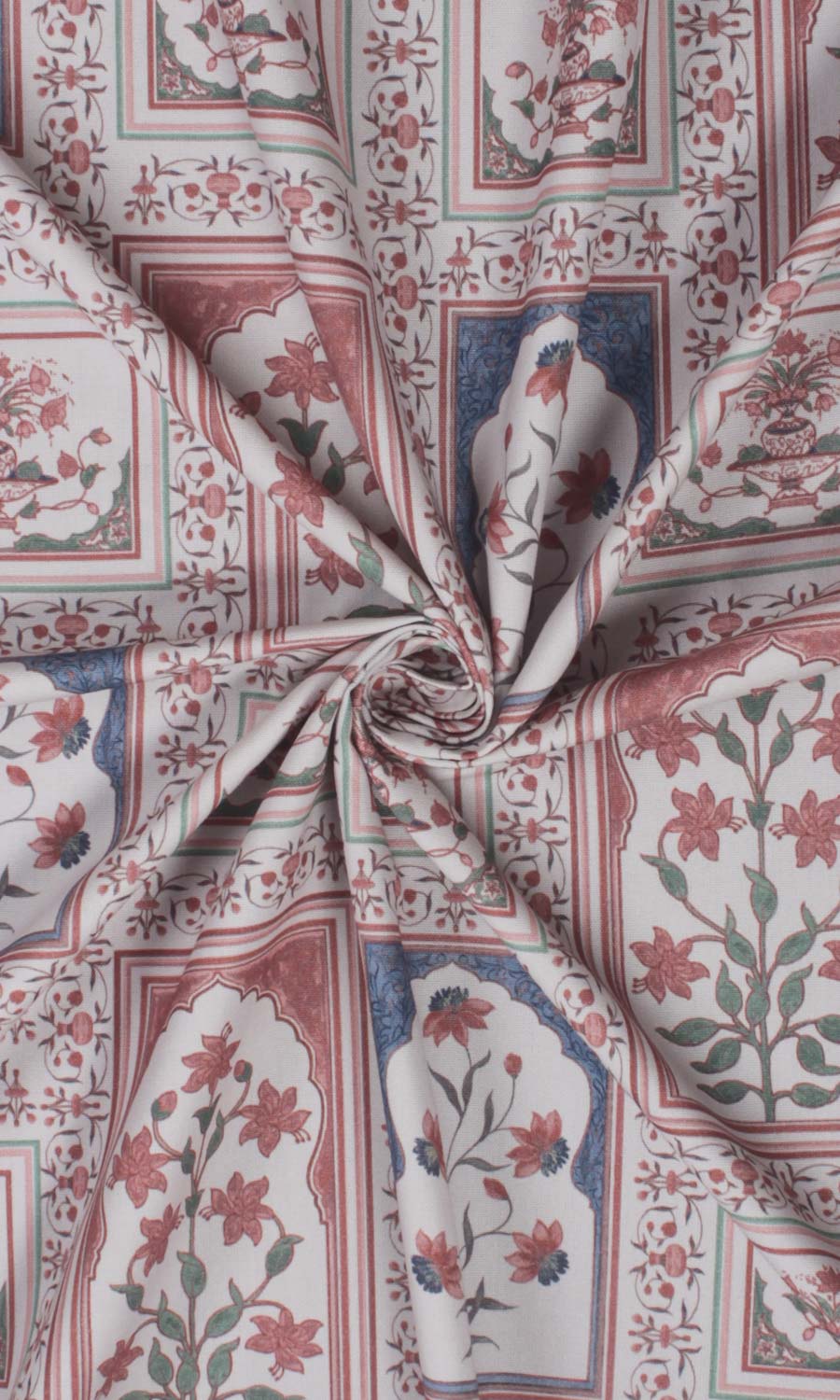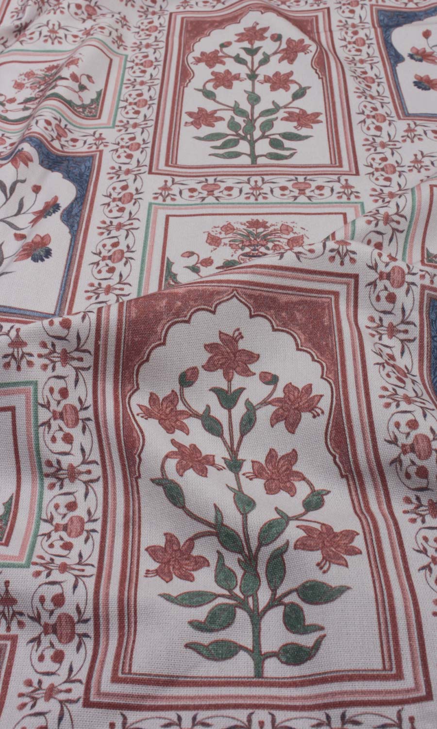 A quiet ode to oriental beauty, 'Leaping Hush' feels like a time-travelling reverie - where Mughal florals unfurl around ornate 'jharokhas' - regal in presence and rich with nostalgia. Printed on an understated greyscale pure cotton base, this fabric beautifully blends classical extravagance with modern simplicity. Whether styled in an eclectic living room, a layered bohemian haven or a maximalist's collected space, this fabric brings an old-world rhythm where heritage and comfort go hand in hand.