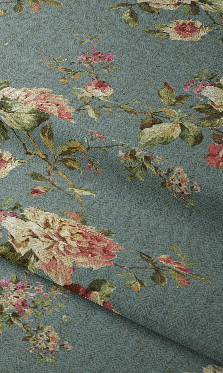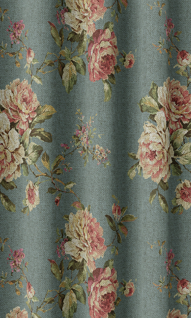 'Moonlight Drive' is a throwback to the Romantic Era of fashion history that gloried in large floral motifs with emphasized softness and dreamy silhouettes. Its naturalistic rose posies are an ode to perennial English gardens teeming with lush roses and native greens. The muted blue backdrop lends it a modern edge so this demure floral can not only adorn traditional rustic homes but also modern country designs and classical-themed spaces.