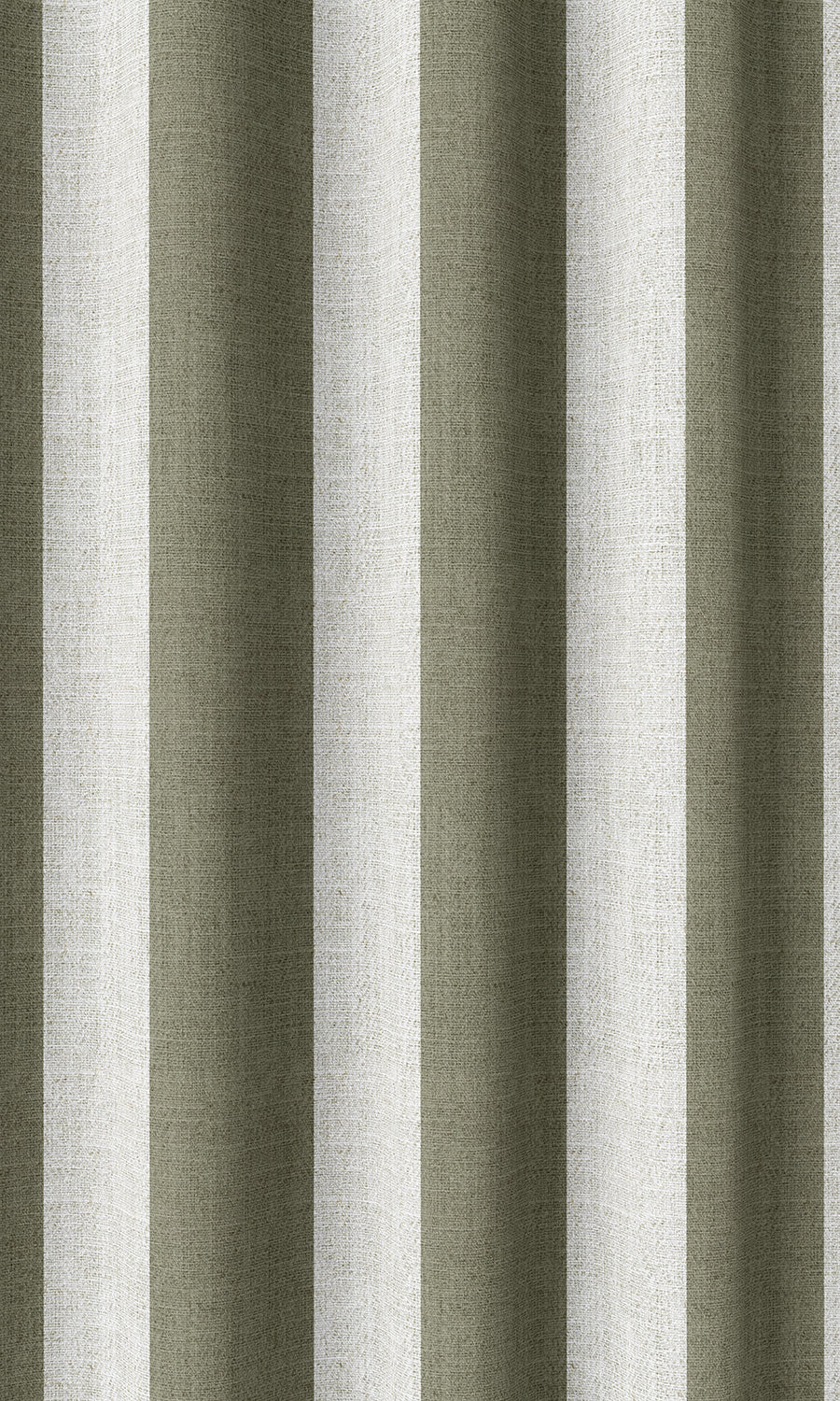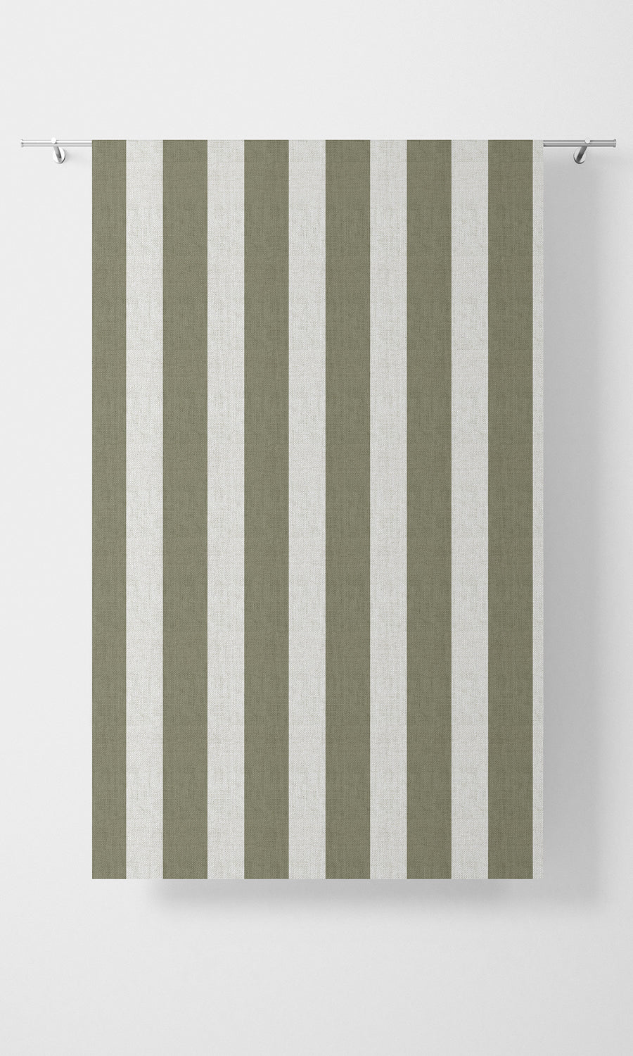 Featuring wide stripes of even width in a green-white palette and textured finish, 'Moss City' offers a timeless aesthetic with a modern edge. Its compelling scale and quiet hues make it a great addition to any room looking for a bold piece sans the vibrance of saturated hues. Let it team up with wooden trestle tables, travertine floors and limewashed walls in rustic spaces, and with sleek furniture, slatted walls and sharp-lined silhouettes in modern settings.