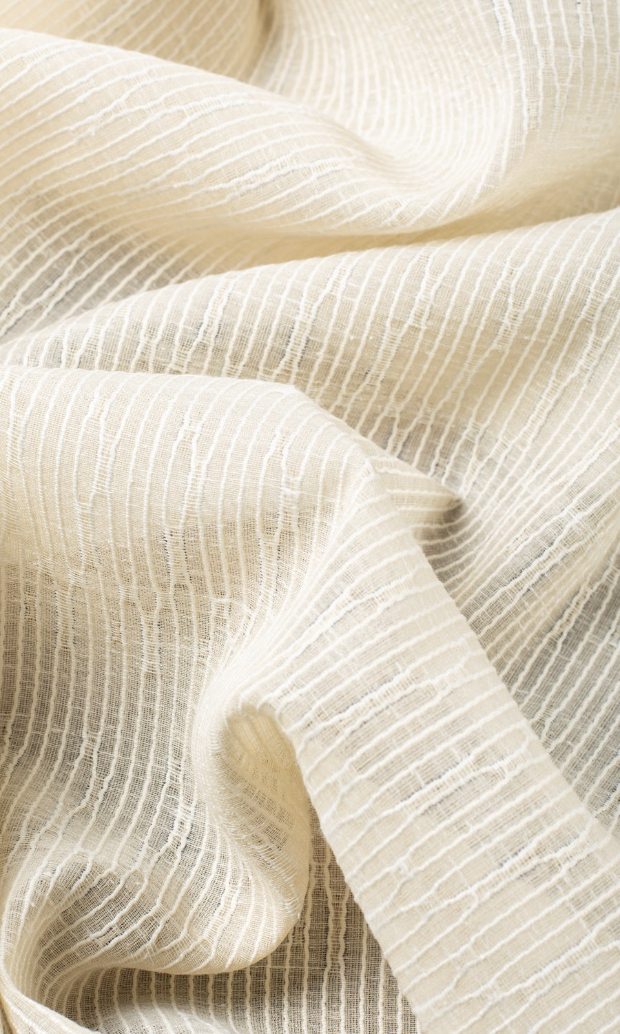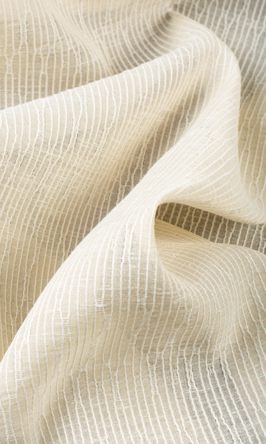 Light as a breath and textured like time-carved grooves on weathered stone, 'Nivara' brings a poetic quiet to any room it graces. Its barely-there translucence allows daylight to drift in gently, casting a serene glow while keeping the world outside. Perfect for minimalist spaces, coastal homes and country cottages, this pale beige/ warm ivory sheer can be the final touch for any space that loves a touch of delicate texture and lace.