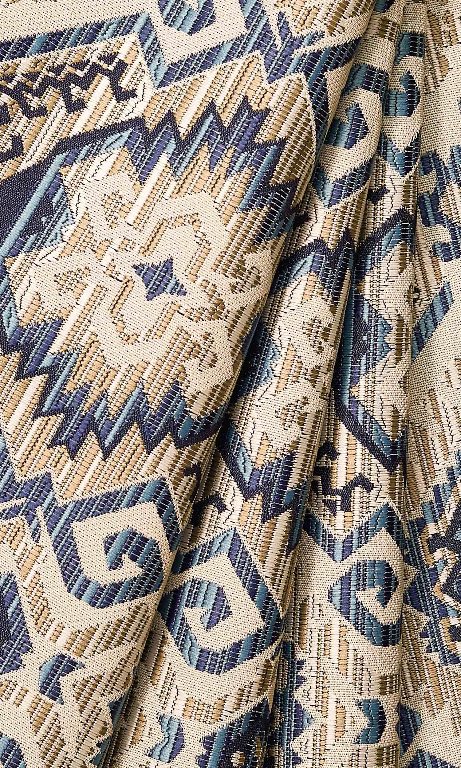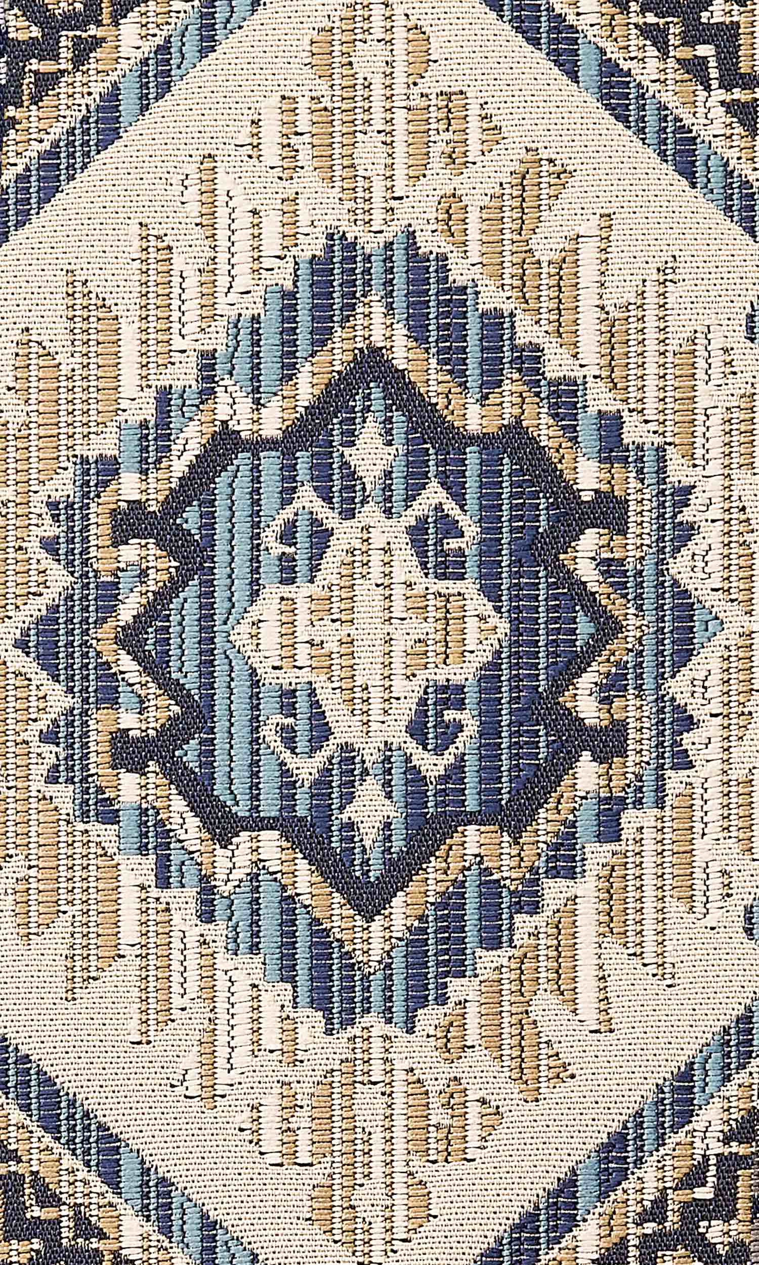 Taking cues from the timeless Navajo-inspired motifs and pouring in the modern element of a palette that intersperses neutral hues with two tones of blue, 'Old Pub' offers eclectic elegance with modern flavours. It epitomises the visual allure of the symmetry and intricacy of southwestern native American geometric patterns. This embellished treat is for those who love to rig up their home with the enchanting beauty of marvellous exotic finds.