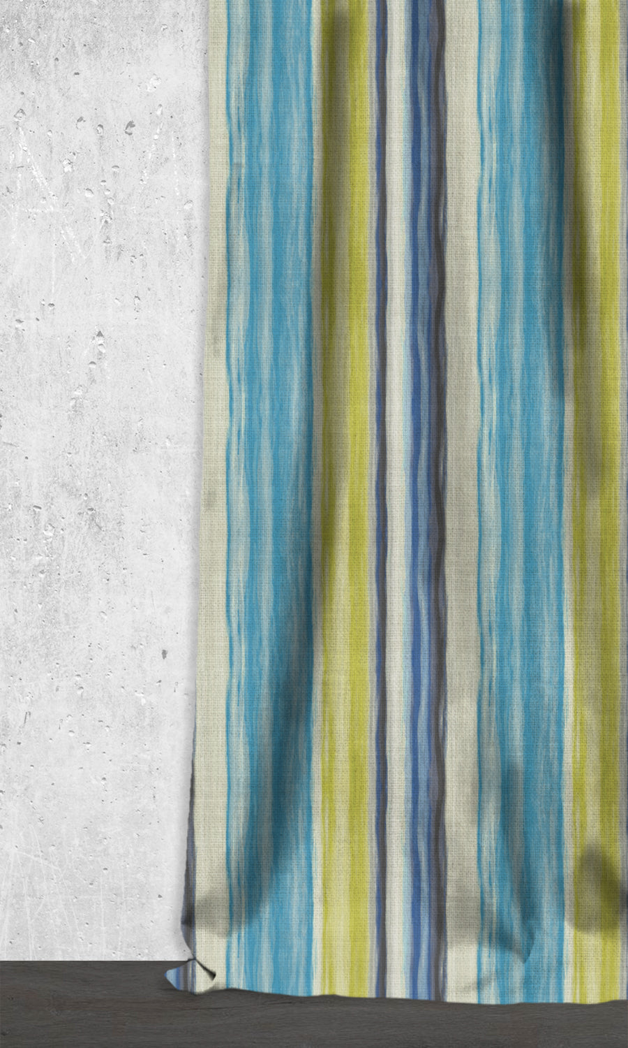 'Open Courtyard' features watercolour-finish wide stripes that look delightfully playful with their wavy silhouettes and lively hues. Its multiple shades of aqua blue, cobalt blue and lime green infuse vibrancy while echoing the kaleidoscopic beauty of nature's elegance. While it can enhance any room and decor style, its dynamic pattern is especially favoured for spaces used for creative pursuits where it can foster imagination and productivity