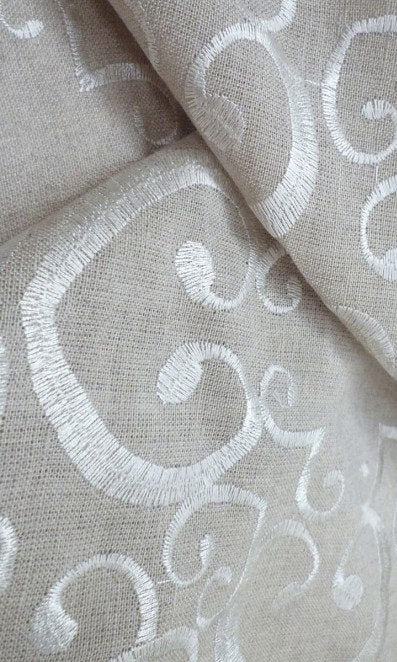 A glad break from plain neutral linens, 'Riley' is full of organic charm. Possessing a unique personality, this pure linen fabric maintains the understated charm of linen while exhibiting the exuberance of a damask-like embroidered pattern. Its non-lustrous natural texture and its earthy hues offer an easy-going vibe that can ground the decor of a lazy family room or sleepy bedroom in a casual lived-in atmosphere. Enjoy this laidback elegance with all the benefits of skin-friendly environmentally sustainable pure linen.