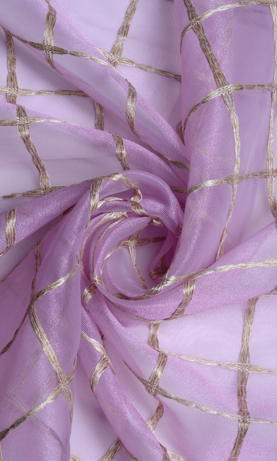 Add a rosy charm to your decor with 'Roseberry Bit's dainty pink and golden accents. With silk-like delicacy, this sheer fabric offers a smooth-lined check lattice pattern in nimble golden embroidery. It is a fitting finishing touch for a teen girl's room, a she-boss' office, a little princess' nursery, or a maximalist living room.