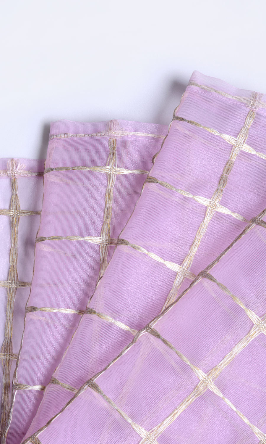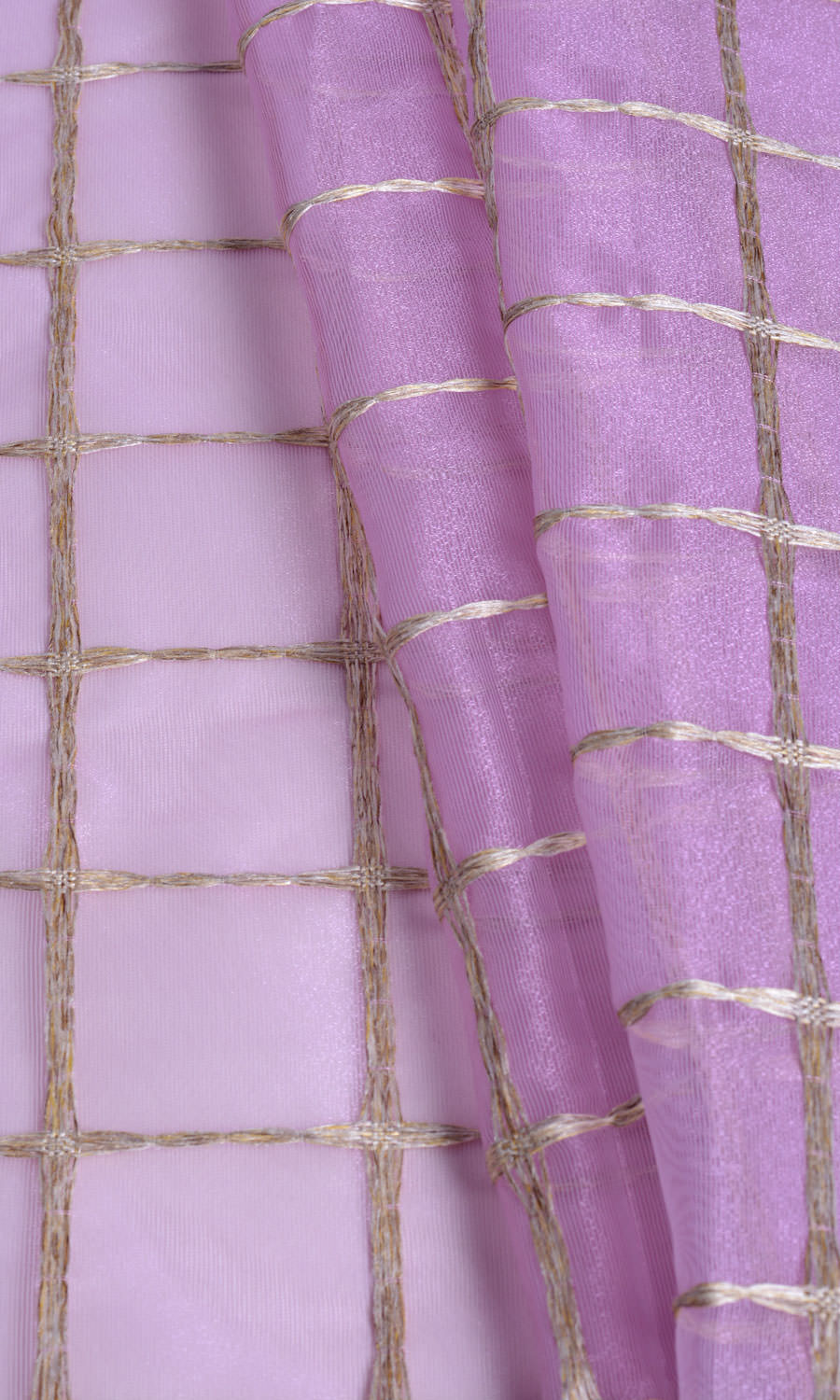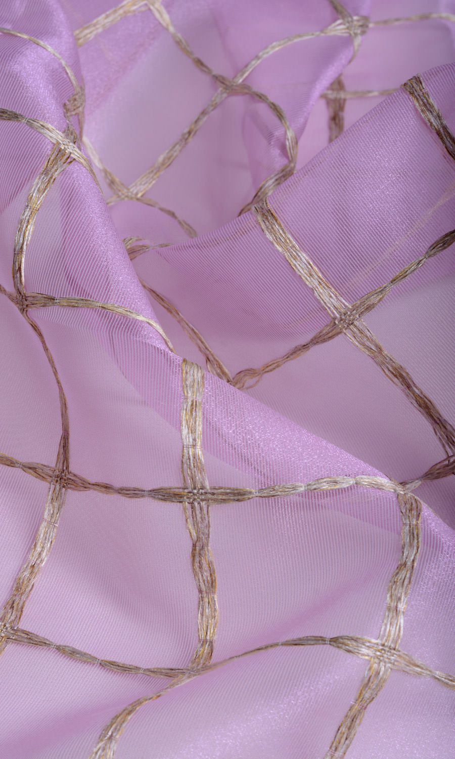 Add a rosy charm to your decor with 'Roseberry Bit's dainty pink and golden accents. With silk-like delicacy, this sheer fabric offers a smooth-lined check lattice pattern in nimble golden embroidery. It is a fitting finishing touch for a teen girl's room, a she-boss' office, a little princess' nursery, or a maximalist living room.