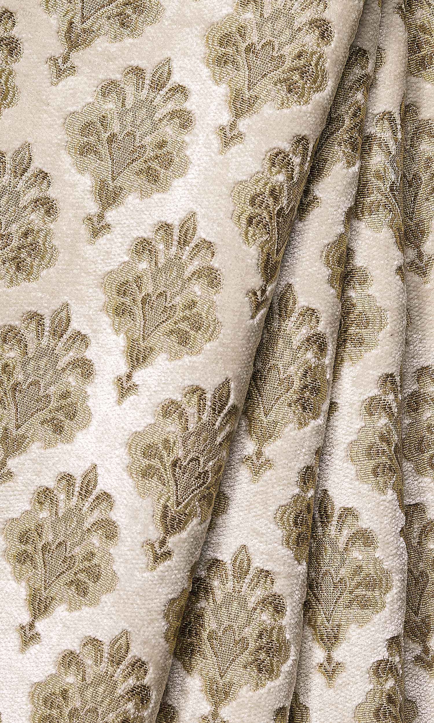 Opulent traditional living rooms and maximalist eclectic decor styles as well as pared back transitional homes can blindly trust their mandate to the regal flourishes, aureate touches and delicate lustre of 'Sahara' moderated by a gentle colour scheme. Its golden damask pattern decked on pristine white velvet can round off any period home's flair for Victorian-style dramatic details and pattern play as eloquently as a classic pared-down Edwardian residence.