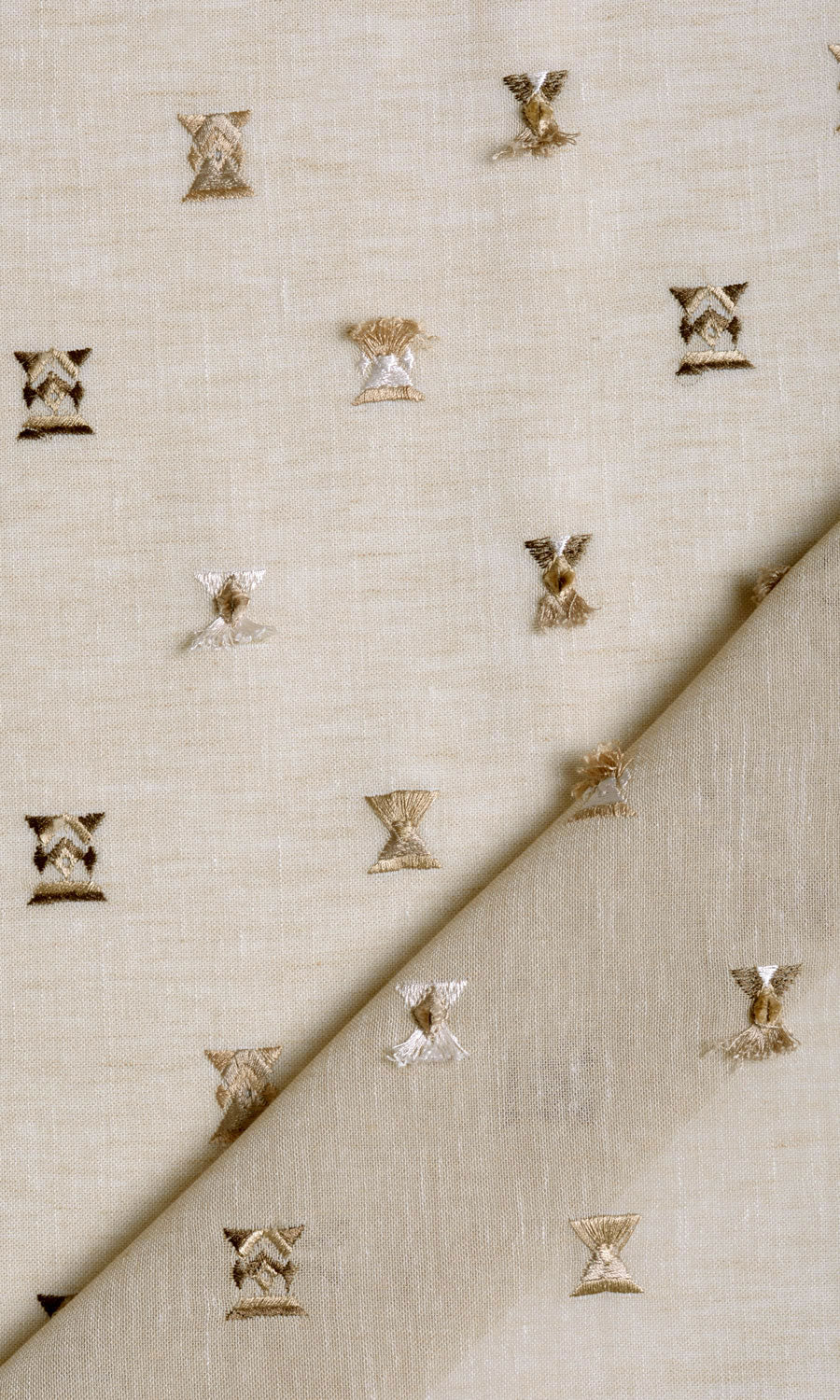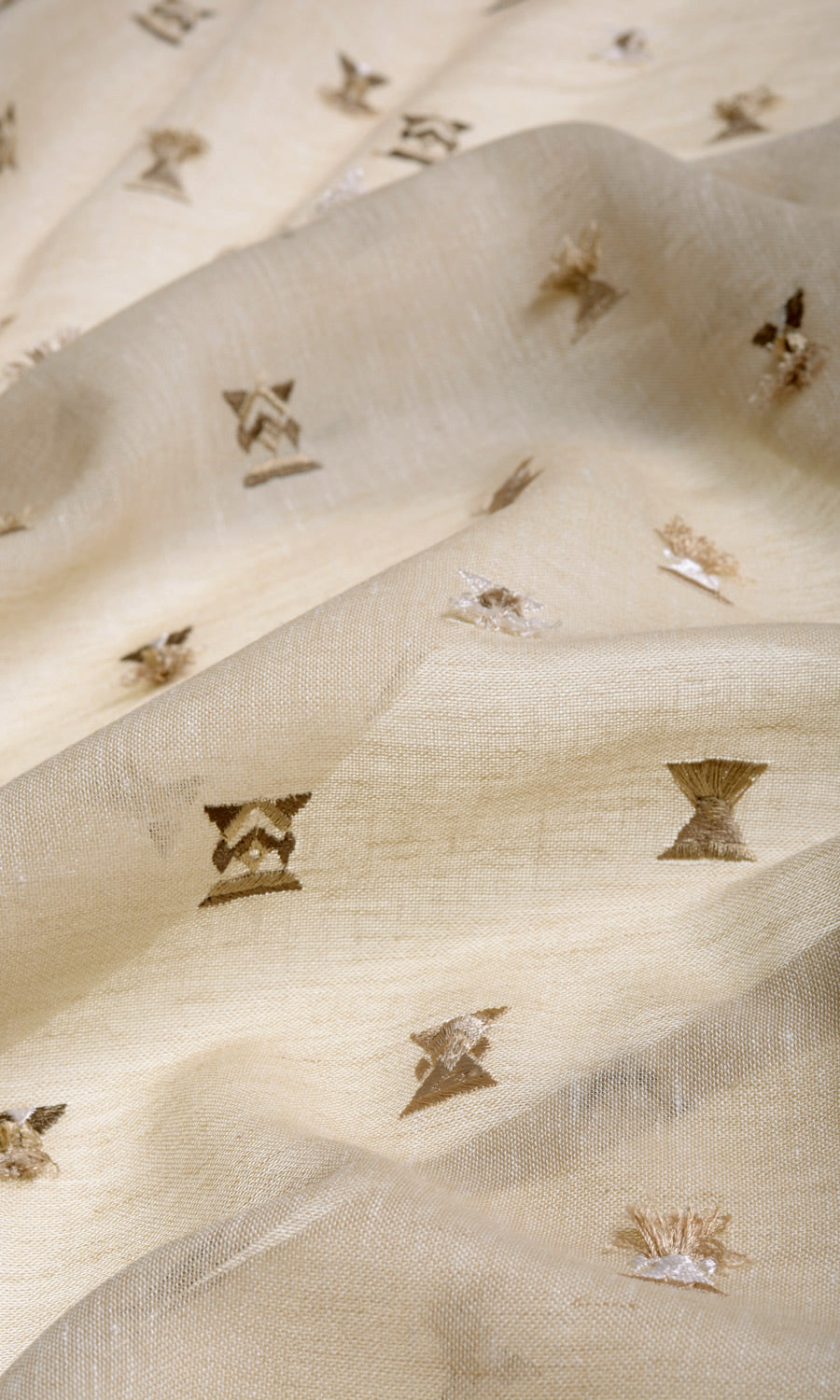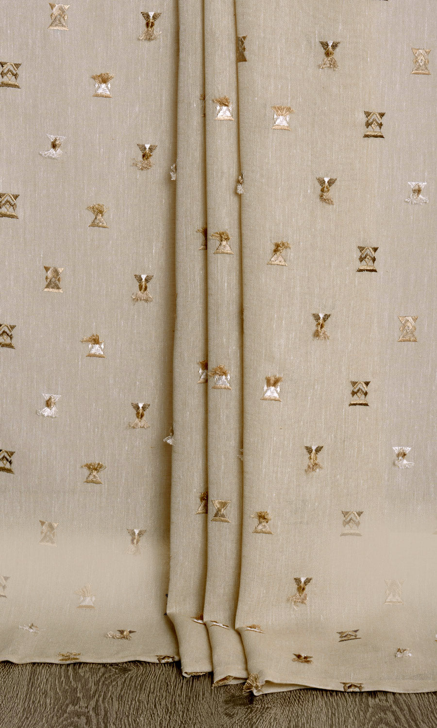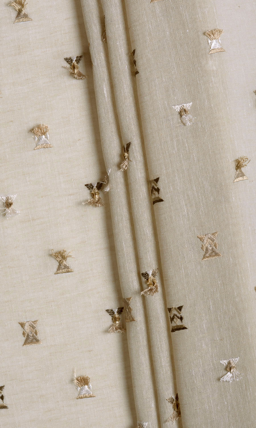 - The textural richness of the fine embroidery on the semi-sheer fabric