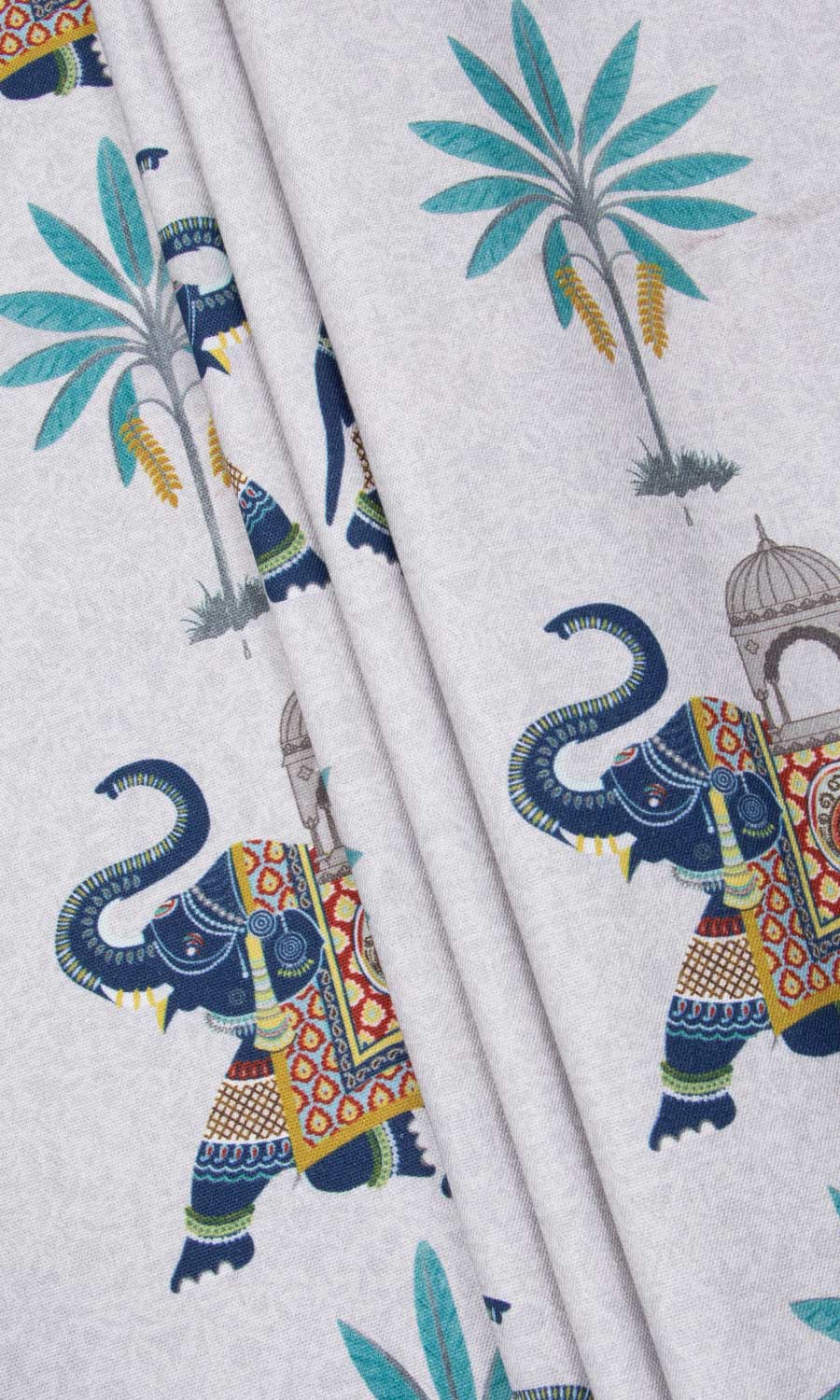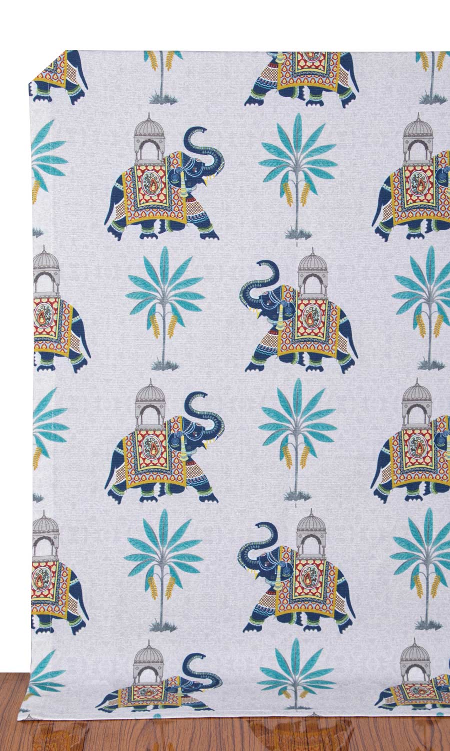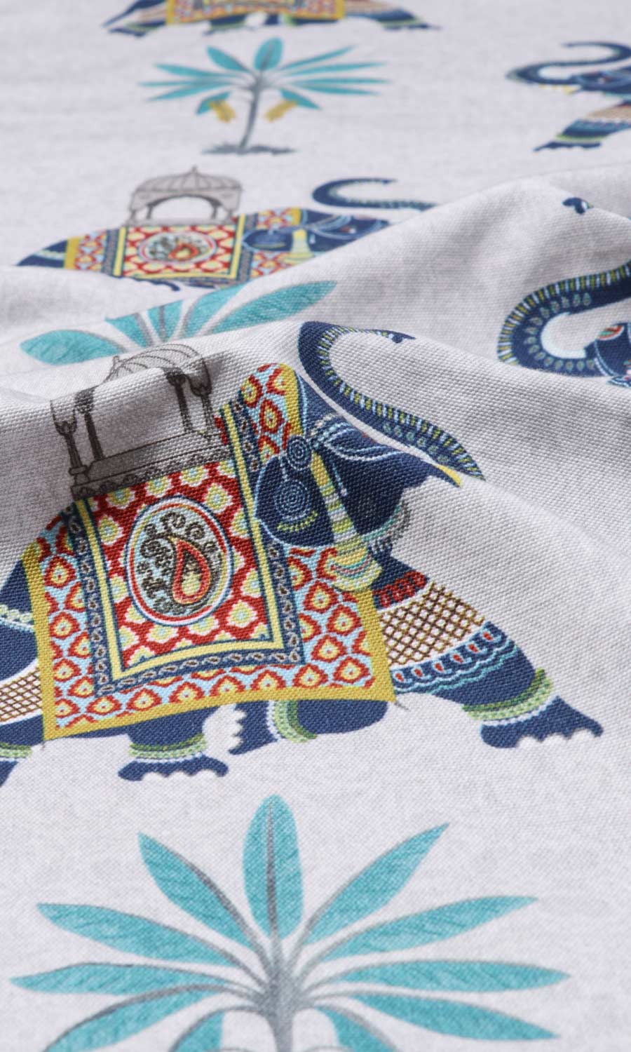 A slice of Mysore's lush tropical landscapes and royal heritage, 'Still Waters' is an eclectic statement piece designed for homes steeped in exotic narratives and cultural tropes. Its artistic depiction of fruit-laden banana plants and embellished elephants with regal howdahs are a nod to the enchanting splendour of oriental traditions. Woven with natural cotton fibres in an attractive palette of grey, navy and aqua blue, this tapestry of historic richness balances classical elegance with casual livability.