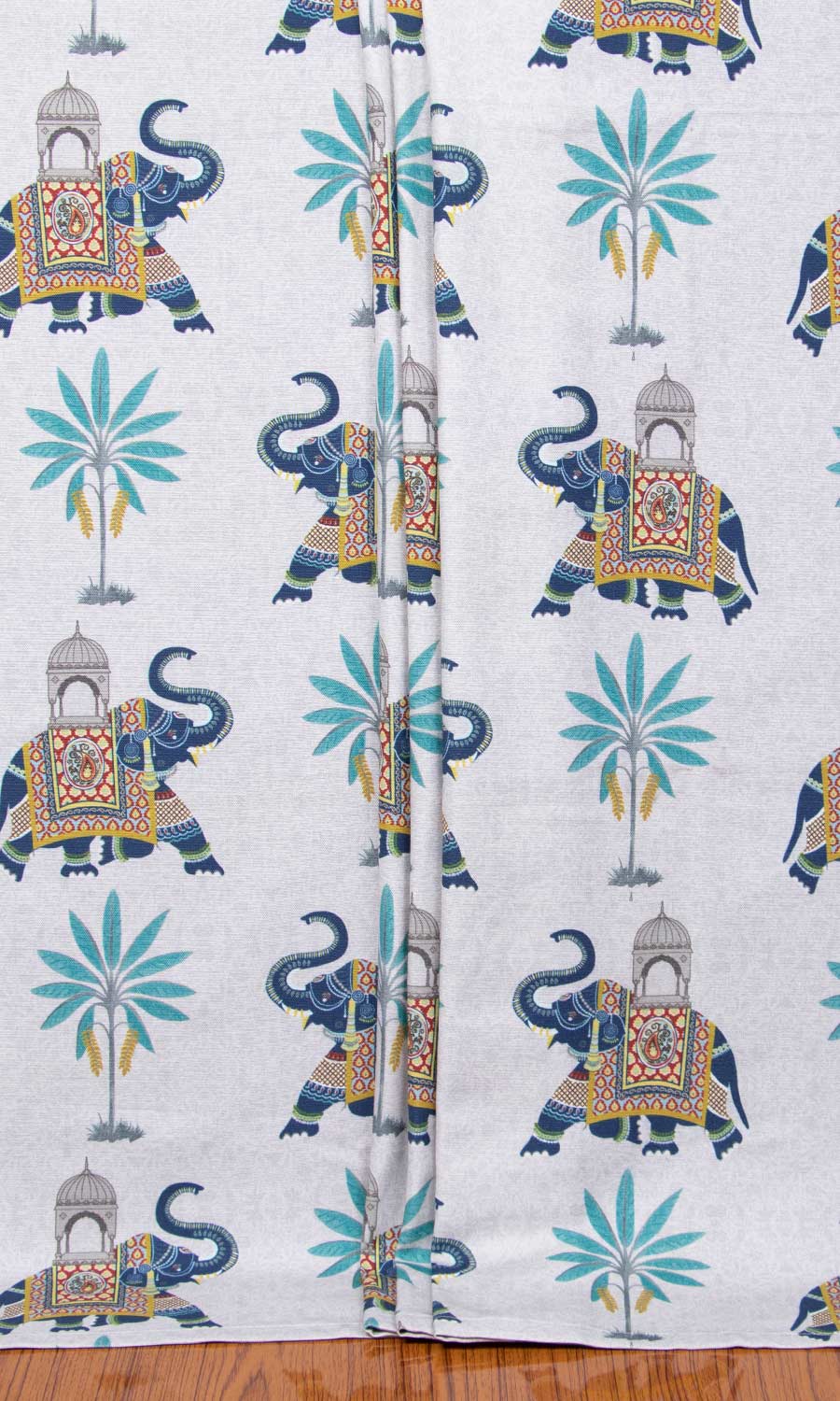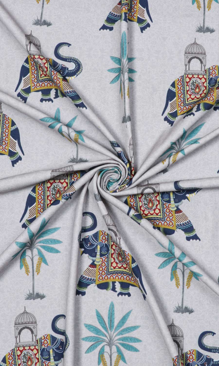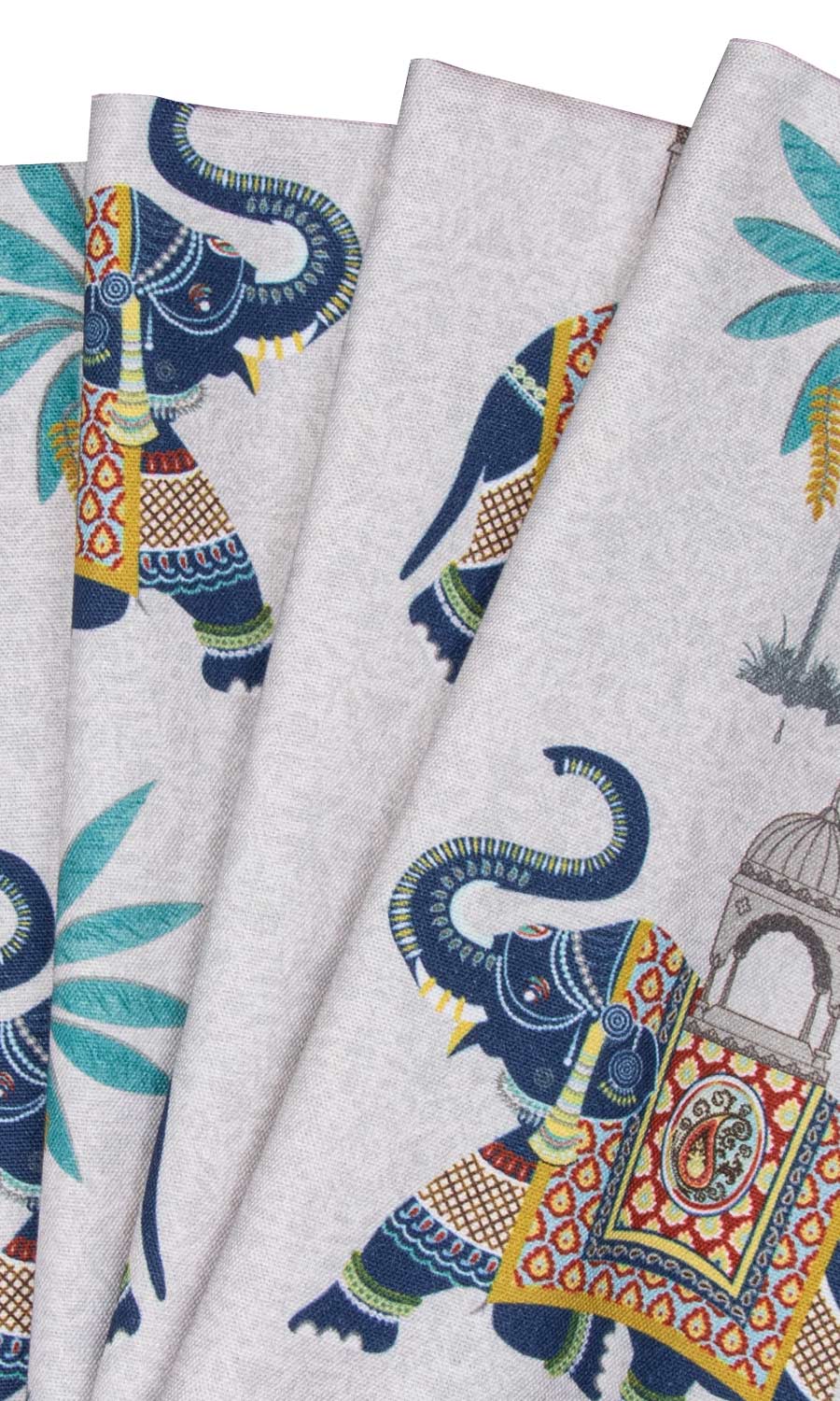 A slice of Mysore's lush tropical landscapes and royal heritage, 'Still Waters' is an eclectic statement piece designed for homes steeped in exotic narratives and cultural tropes. Its artistic depiction of fruit-laden banana plants and embellished elephants with regal howdahs are a nod to the enchanting splendour of oriental traditions. Woven with natural cotton fibres in an attractive palette of grey, navy and aqua blue, this tapestry of historic richness balances classical elegance with casual livability.