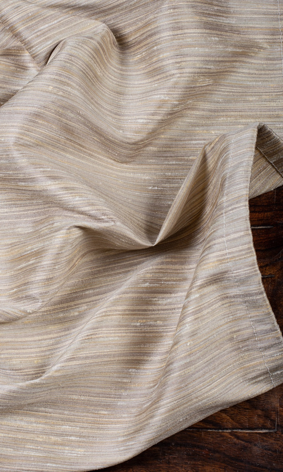 Timelessly elegant and effortlessly glamorous, 'Sugar Can' is a beige faux silk that echoes the mellow richness of sunlit sand and aged parchment. Its gentle, sandy tone, deepened and softened in a rhythmic flow by fine striations, offers an interplay of lustre and texture. Its graceful drape and soft glow are the perfect layer for serene interiors that embrace light, air and quiet luxury.