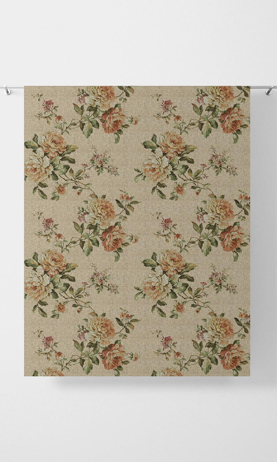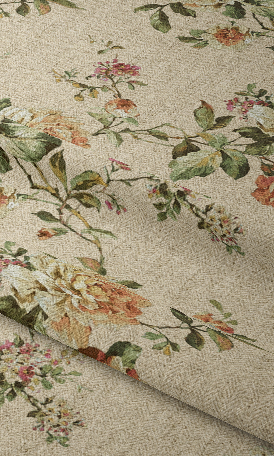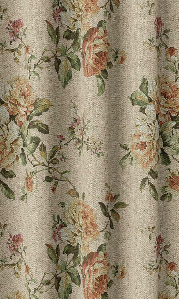 'Sunday Frock' is a throwback to the Romantic Era of fashion history that gloried in large floral motifs with emphasised softness and dreamy silhouettes. Its naturalistic rose posies are an ode to perennial English gardens teeming with lush roses and native greens. The neutral beige backdrop lends it a modern edge so this demure floral can not only adorn traditional rustic homes but also modern country designs and classical-themed spaces.