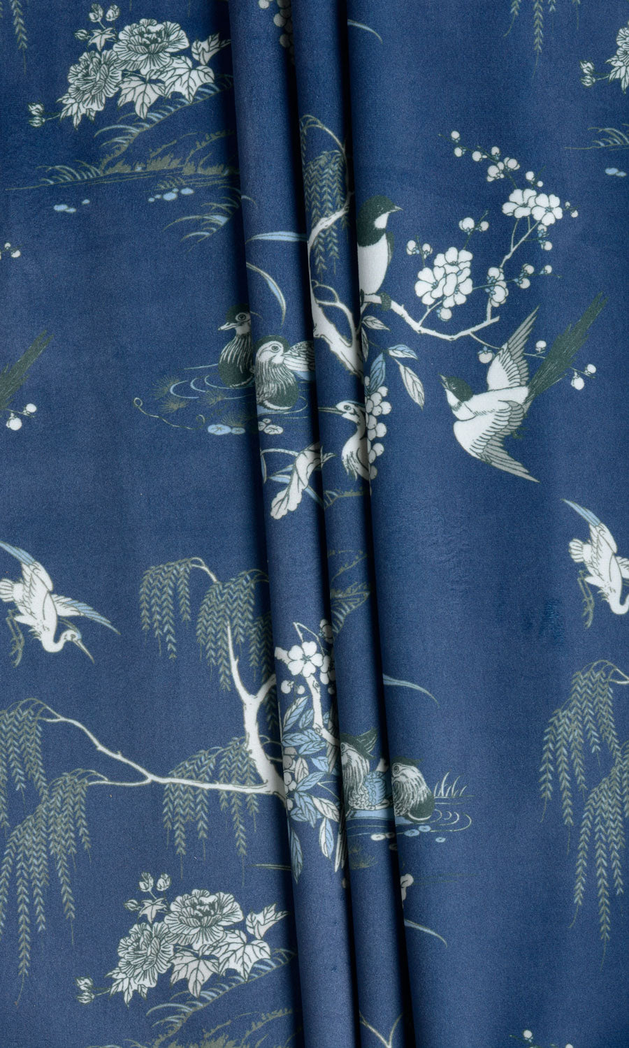 A poetry in motion, 'Sweet Saphyre' features a graceful toile print of roosting birds and waterfowls that evokes the serenity of a beautiful countryside view. Its navy blue deepened by the plush velvet texture captures the composure of thick forests while its white accents stand out in contrast, narrating a story of whimsy and history.