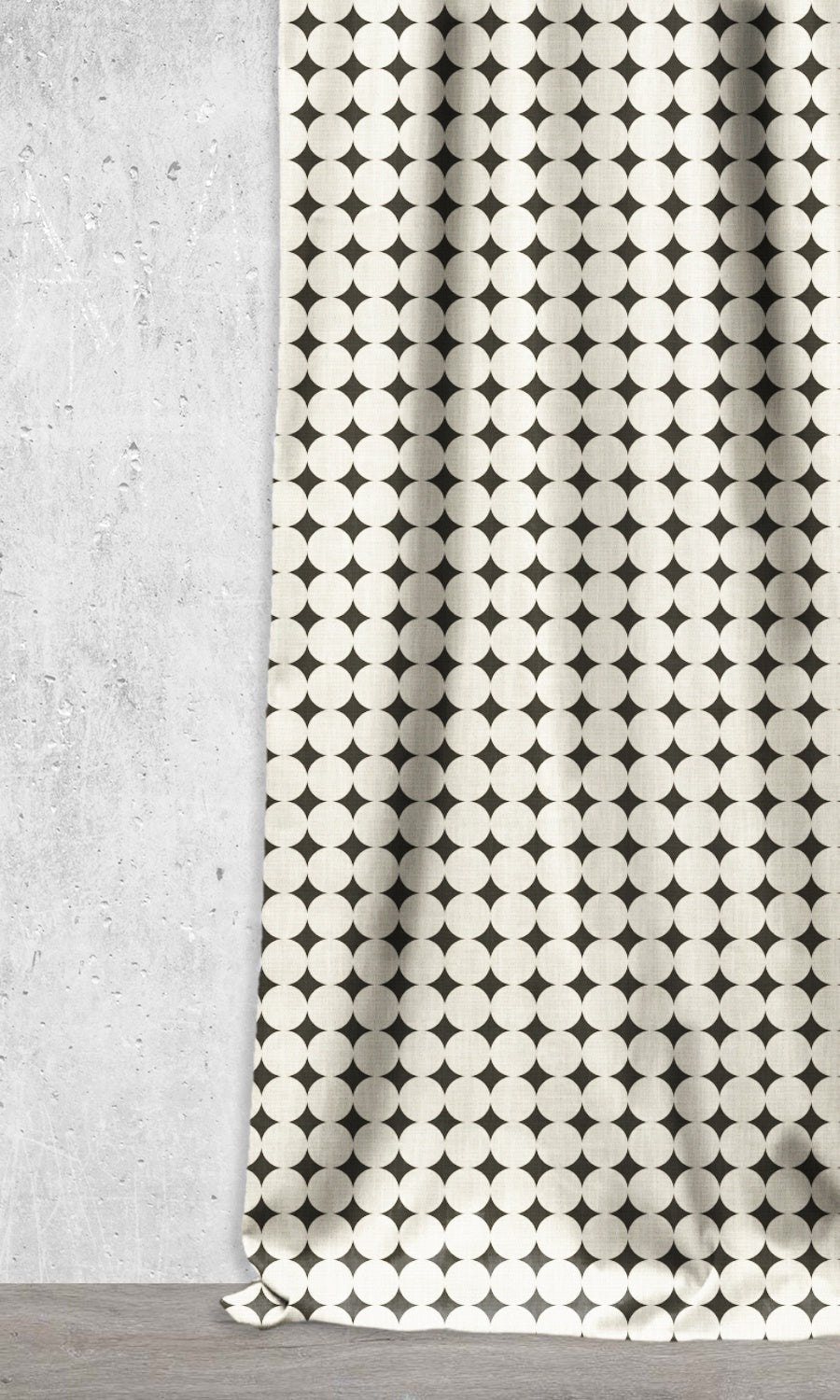 'Tap Dance' features a lively polka print where the clever arrangement of motifs playfully shifts between star and circle, keeping the eye on its toes. The overall print offers a visually stimulating effect with its high-contrast bustling lines and suits right for an Art Deco or Mid-century Modern home that leans on sharp-edged patterns. Capable of mixing with both modern and retro-style homes, this monochrome print fabric is a versatile piece that will likely stay relevant to your evolving tastes.