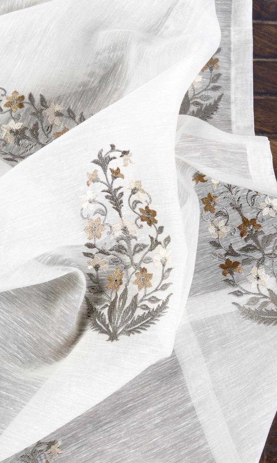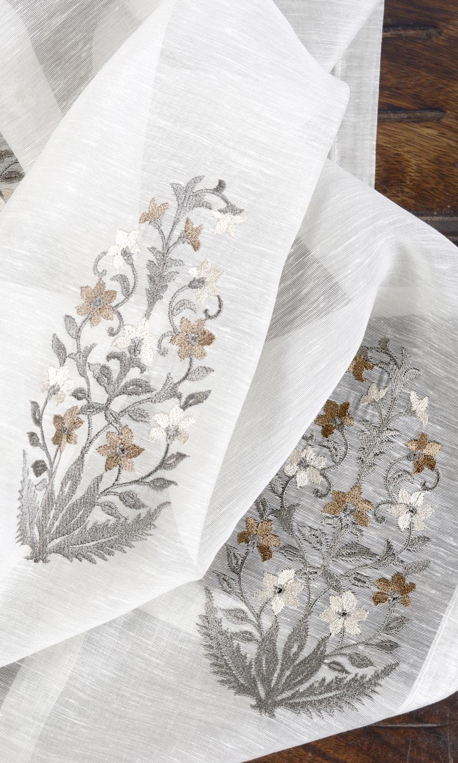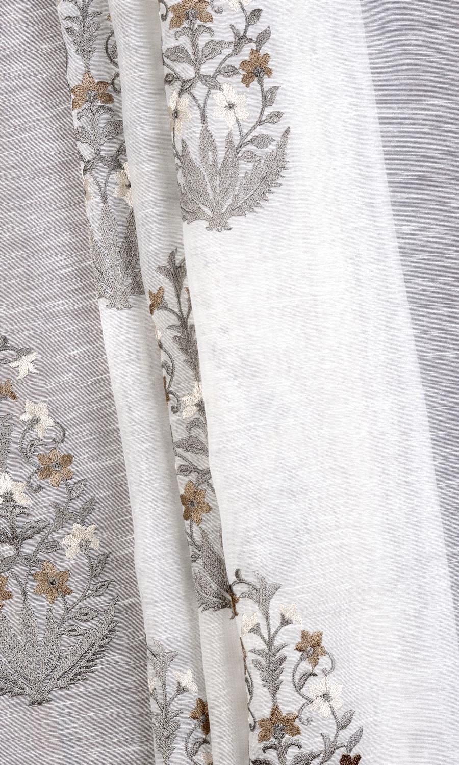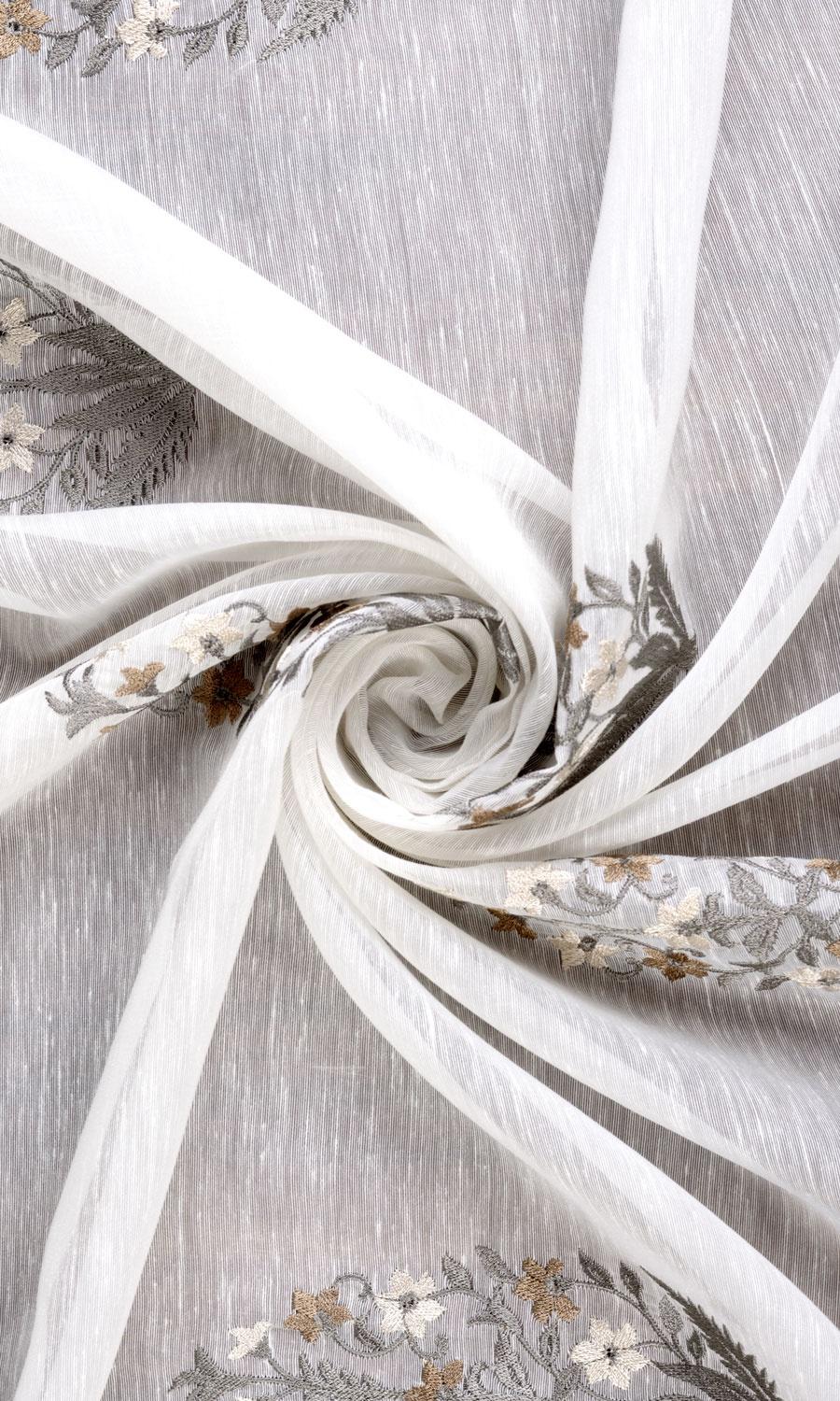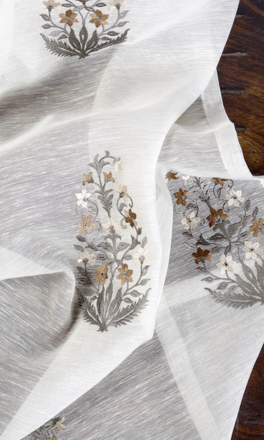 Marrying the timeless charm of heritage motifs with the homely warmth of needlepoint florals, 'Tattle Tan' beckons a beauty that is unforgettable. The hush of white sets the stage for brown blossoms cradled in grey fronds to bring an earthy, organic feel to the room. While the ornate paisleys make a winsome ambience, its white sheer base brings in light, air and a whimsical joy - all without trading off your privacy.