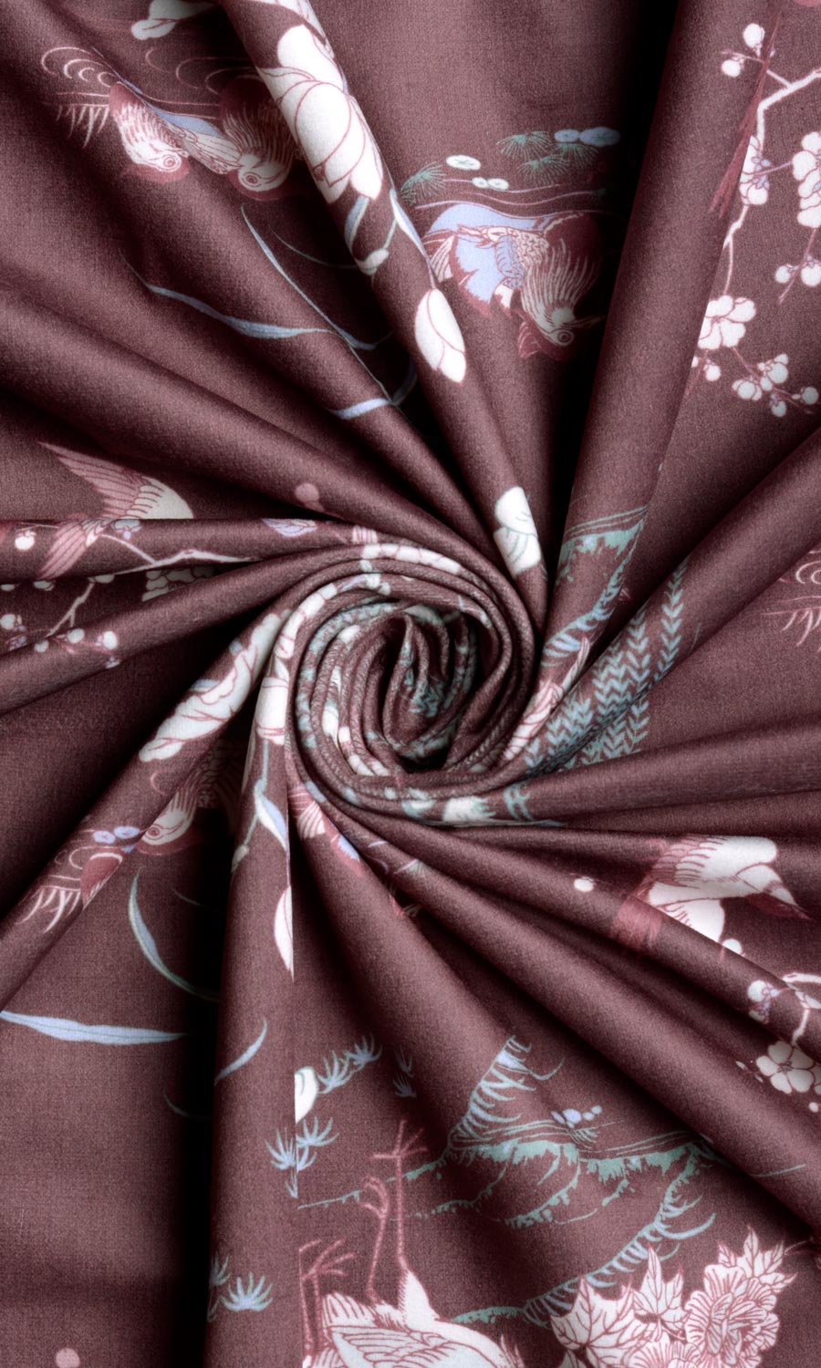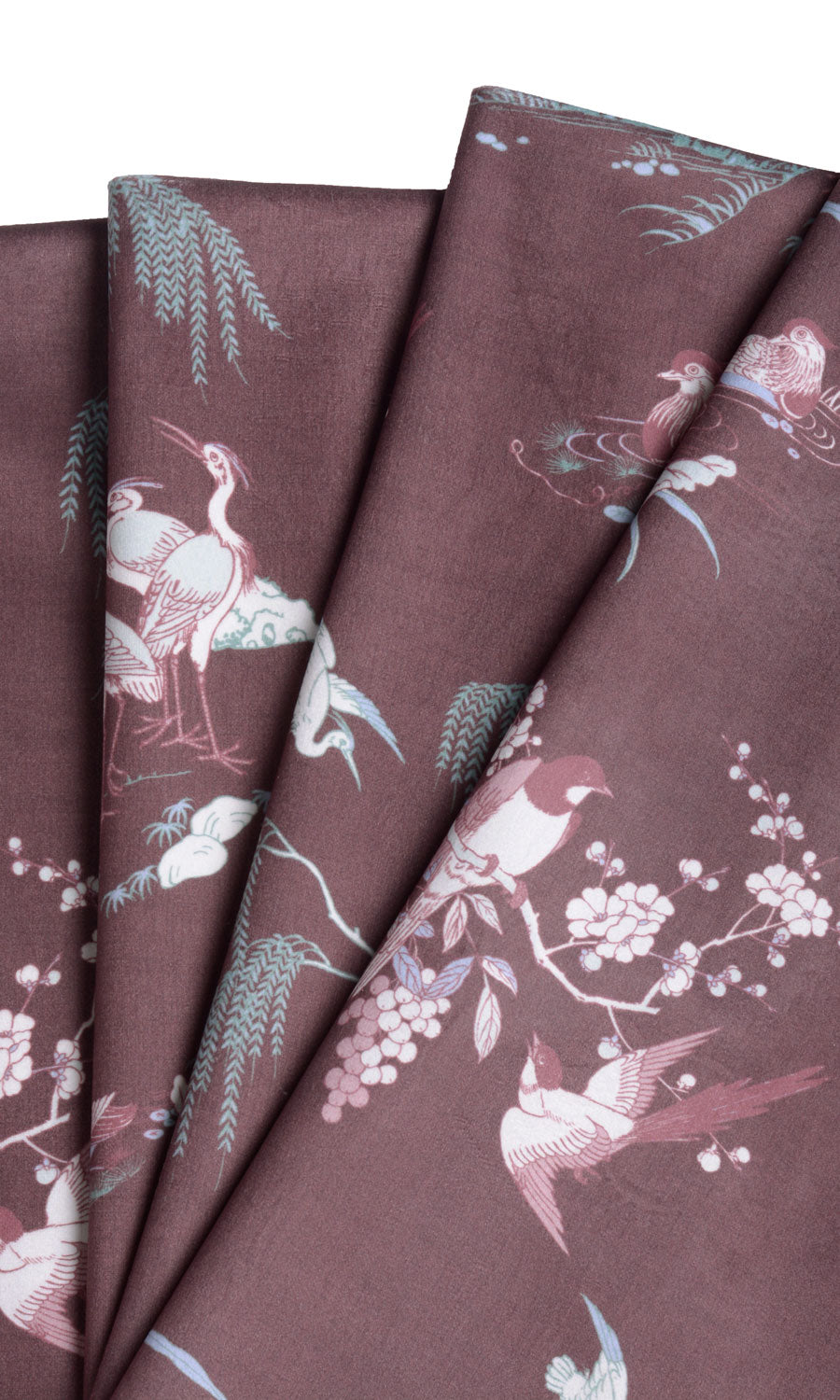 A poetry in motion, 'Teracotta Pot' features a graceful toile print of roosting birds and waterfowls that evokes the serenity of a beautiful countryside view. Its burgundy red deepened by the plush velvet texture captures the composure of thick forests while its white accents stand out in contrast, narrating a story of whimsy and history.
