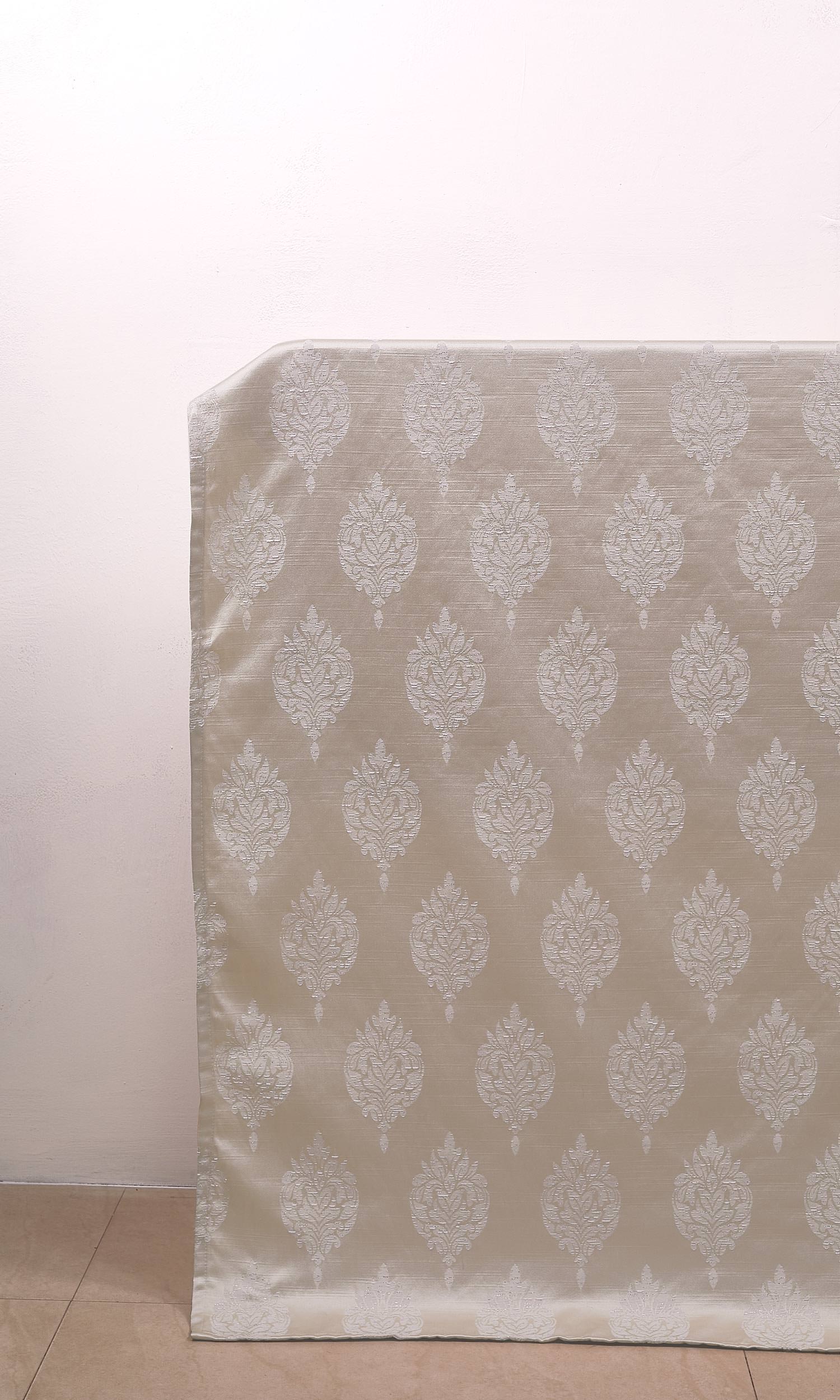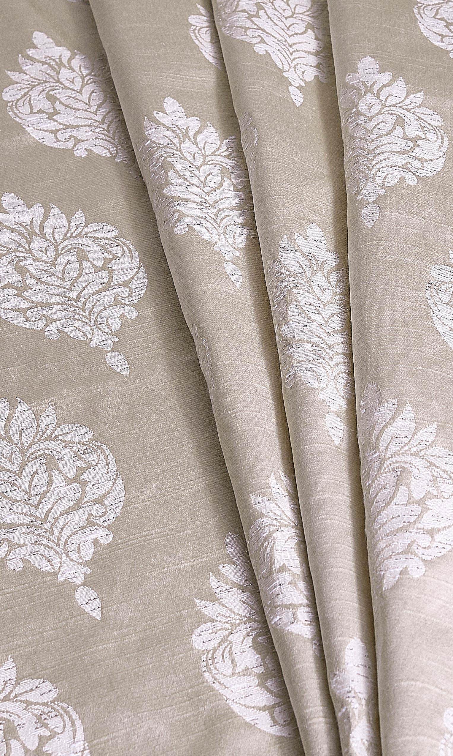 Clients looking for a fetching classical drapery to counterbalance their colour-driven traditional home often fall for 'Theia's classic elegance painted with warm neutral hues. With a cream damask pattern floating on its champagne gold backdrop, this drapery puts the spotlight on the exquisiteness of the motif. Accentuate the formal opulence of a classical living/dining room with the silken beauty and artful grace of this resplendent drapery.