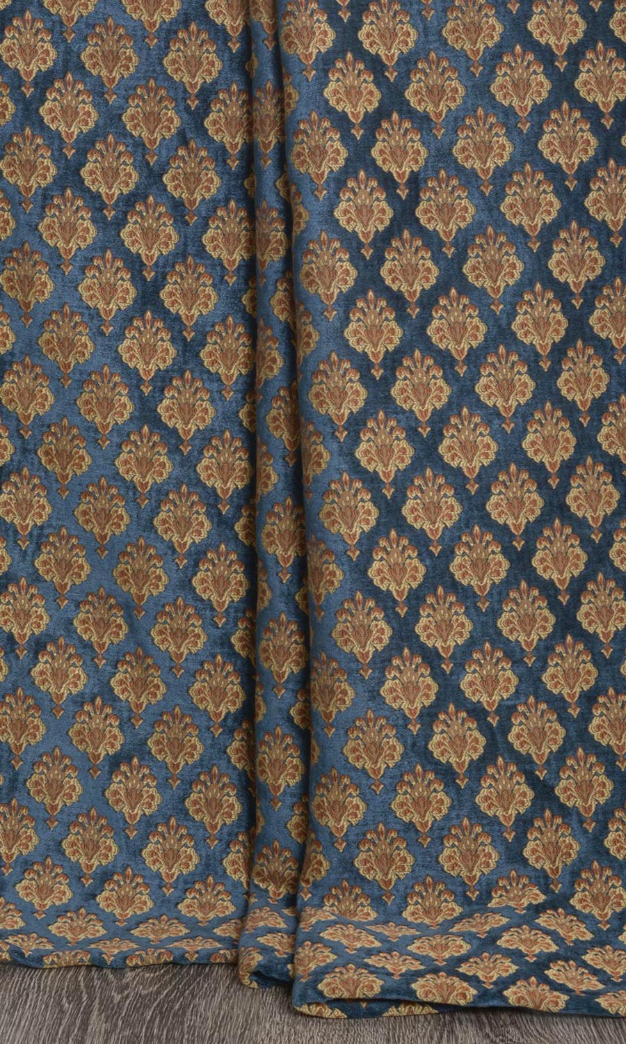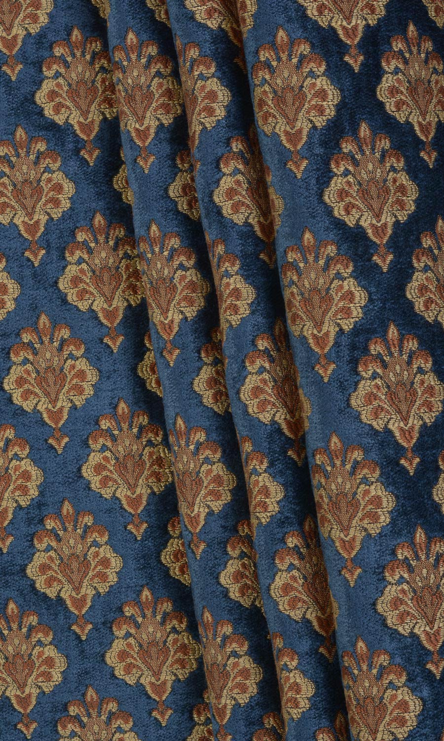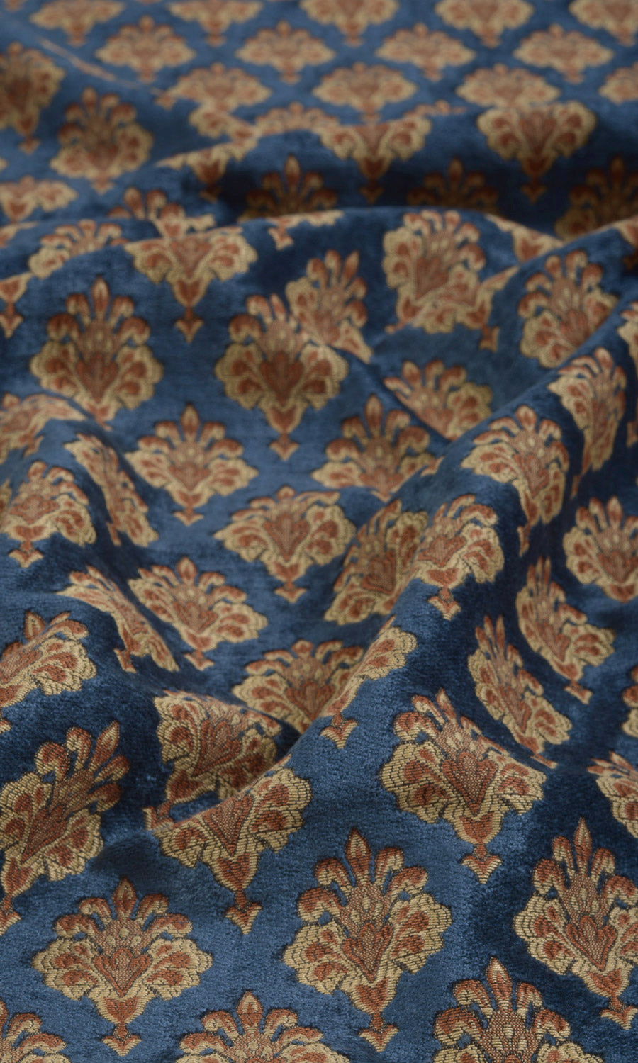 Opulent traditional living rooms and maximalist eclectic decor styles can blindly trust their mandate to the regal flourishes, aureate touches and delicate lustre of 'Truly Paradise'. Its golden damask pattern decked on deep navy blue velvet can round off any period home's flair for Victorian-style dramatic details and pattern play.