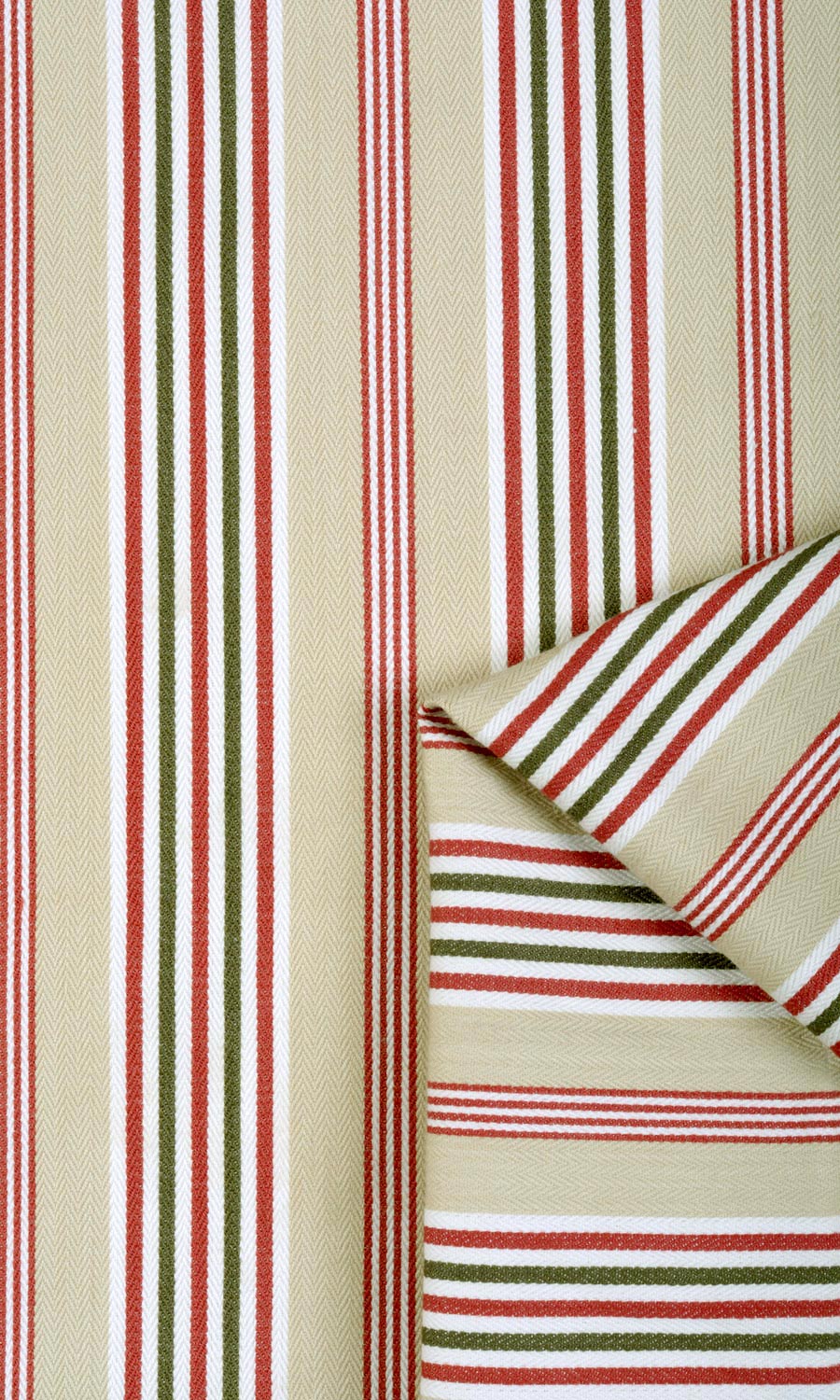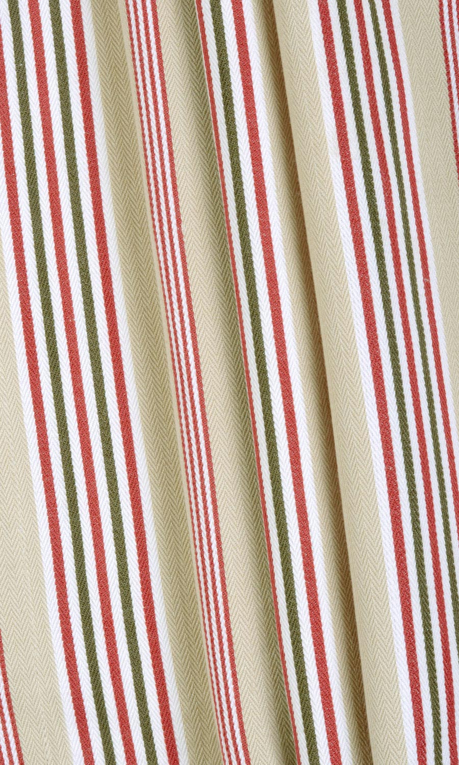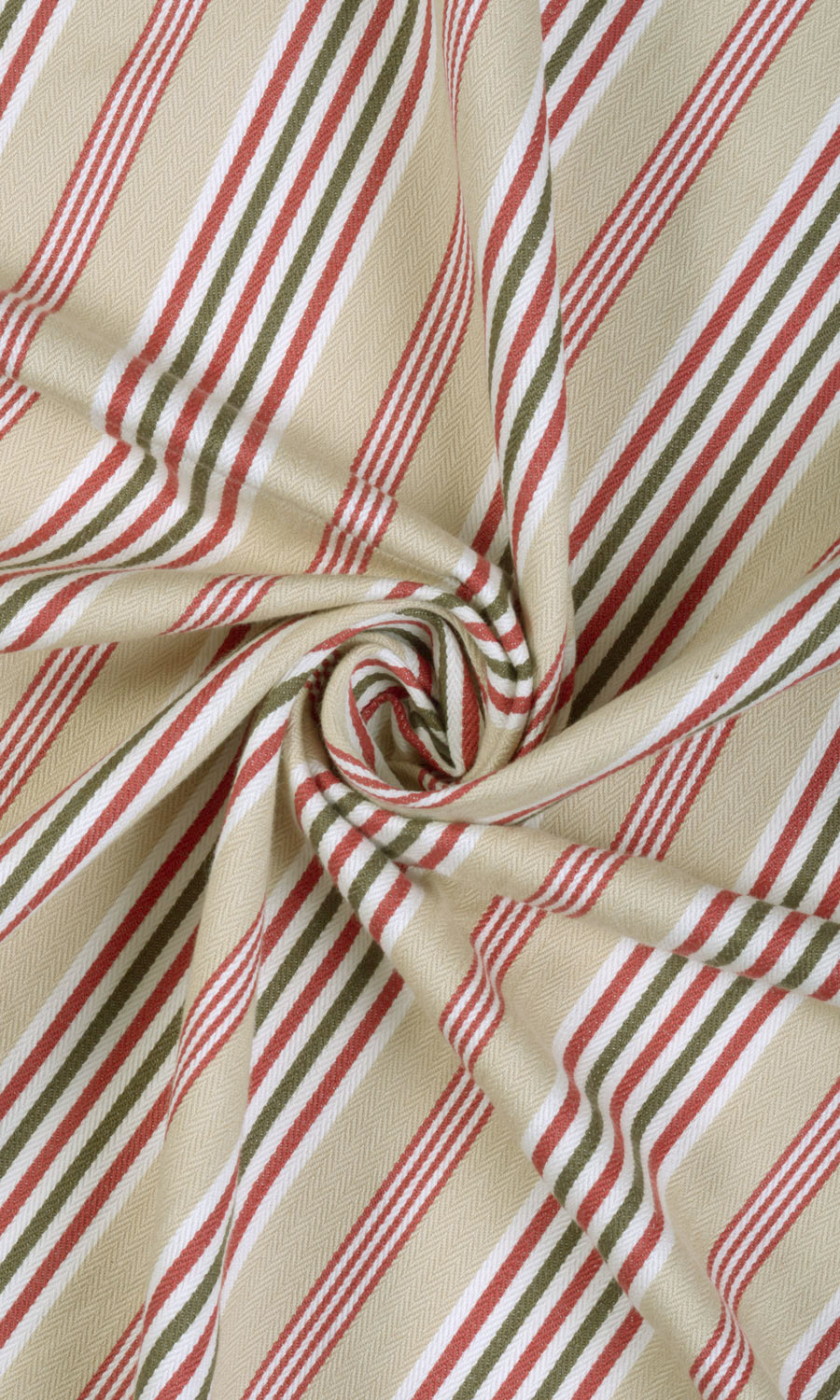 Not with the allure of loud colour or opulent lustre but with the quiet charm of natural colours and organic texture, 'Windless Tips' depicts the power of simplicity. This country-style striped fabric offers a simple pattern of stripes in a subdued palette of beige and green, accented by red that can round off a rustic home's bucolic themes. Pair with leather, burlap and jute accessories to carry forward the theme of natural materials and muted hues.