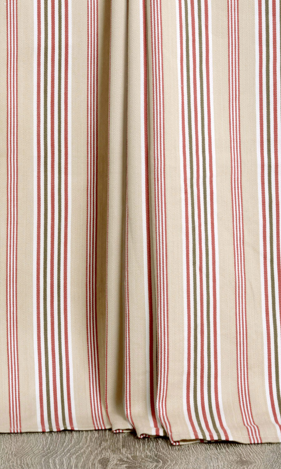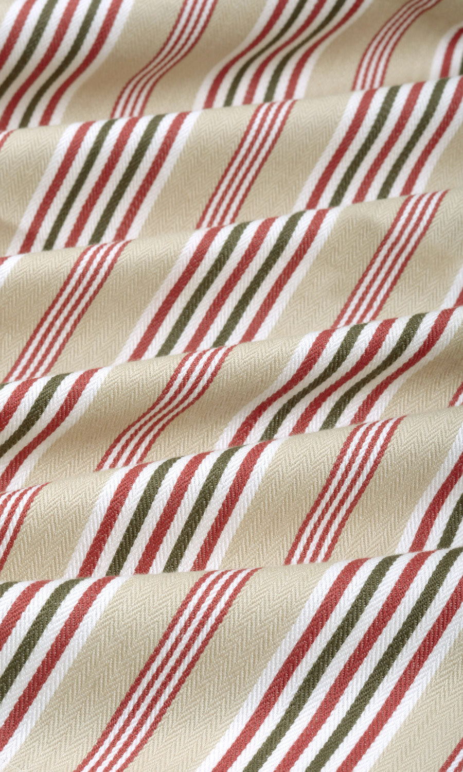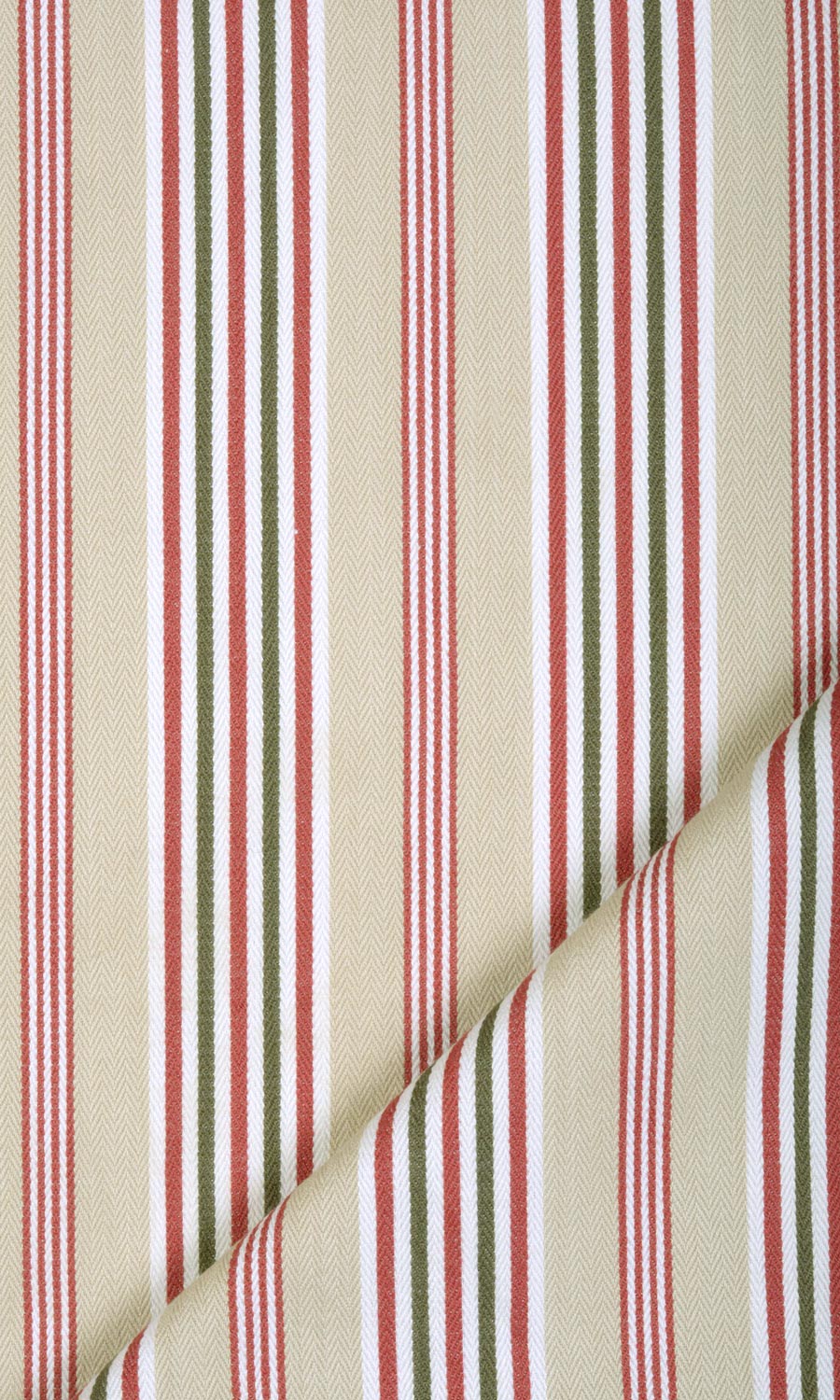 Not with the allure of loud colour or opulent lustre but with the quiet charm of natural colours and organic texture, 'Windless Tips' depicts the power of simplicity. This country-style striped fabric offers a simple pattern of stripes in a subdued palette of beige and green, accented by red that can round off a rustic home's bucolic themes. Pair with leather, burlap and jute accessories to carry forward the theme of natural materials and muted hues.