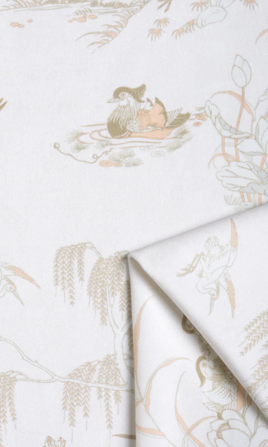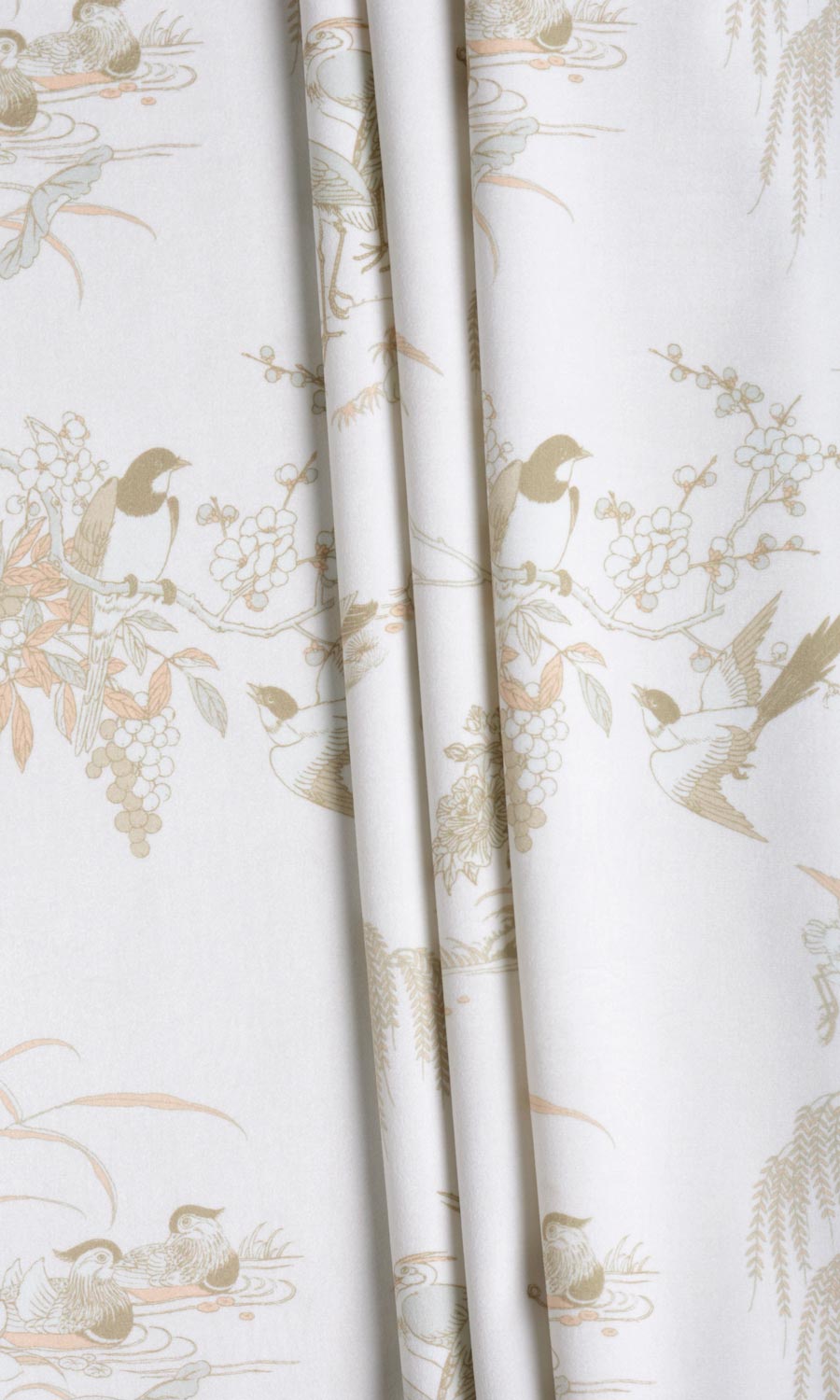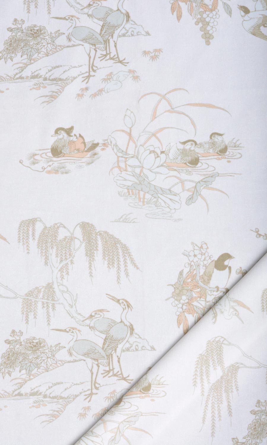 The opulence of delicate lustre and the historic charm of classical toile merge in 'Winter Sonnet'. This white velvet fabric featuring a brown toile print of water birds is a beautiful blend of traditional motifs and a contemporary palette, fitting for modern classical homes and eclectic decor settings.