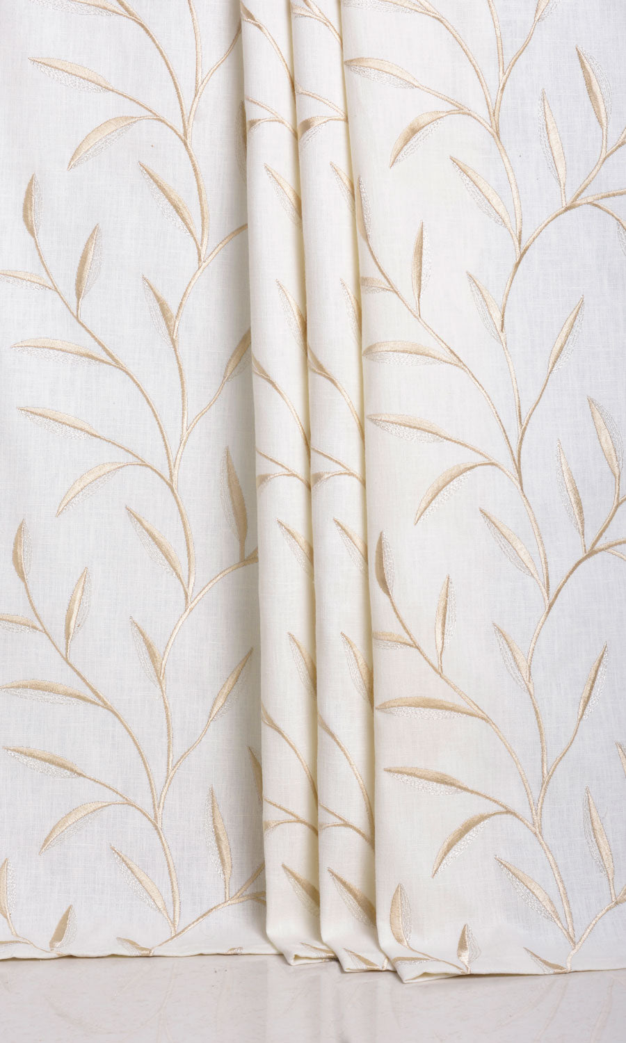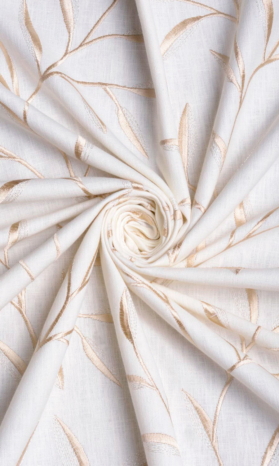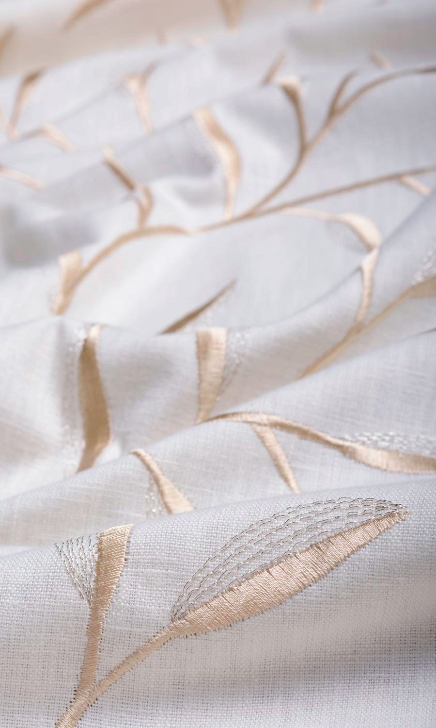 A moment stolen from a whimsical fairytale or a misty countryside view frozen in time! 'Zahabia' offers elegant floral vines in a soft palette of rustic white slubby linen and subtly radiating cream-beige embroidery. It's a lightweight linen-blend that can dress up an airy living room, a light-bathed sunroom or a classical-style lavish bathroom - promising a slice of nature's charm wherever it rests.