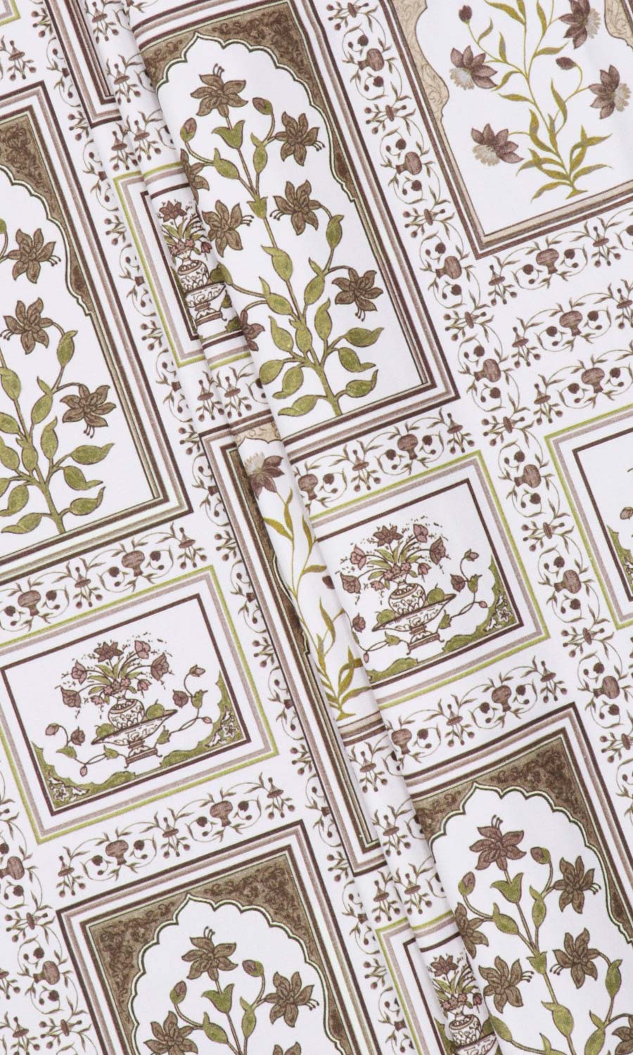 A montage of classical Indian motifs, 'Zarin' is a pure cotton fabric where timeless oriental artistry meets modern understated elegance. Inspired by the ornate 'jharokhas' and floral embellishments of the Thar's Mughal palaces, yet grounded in the casual livability of cotton and humble earthy hues, this fabric is a unique blend of regal grandeur and laid-back aesthetic. It is perfect for eclectic interiors, casual living spaces and bohemian retreats that celebrate both heritage and comfort.